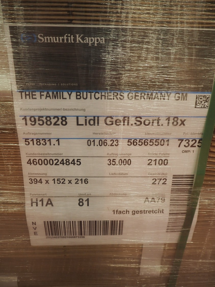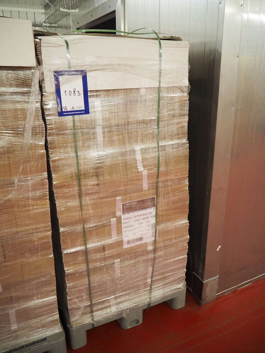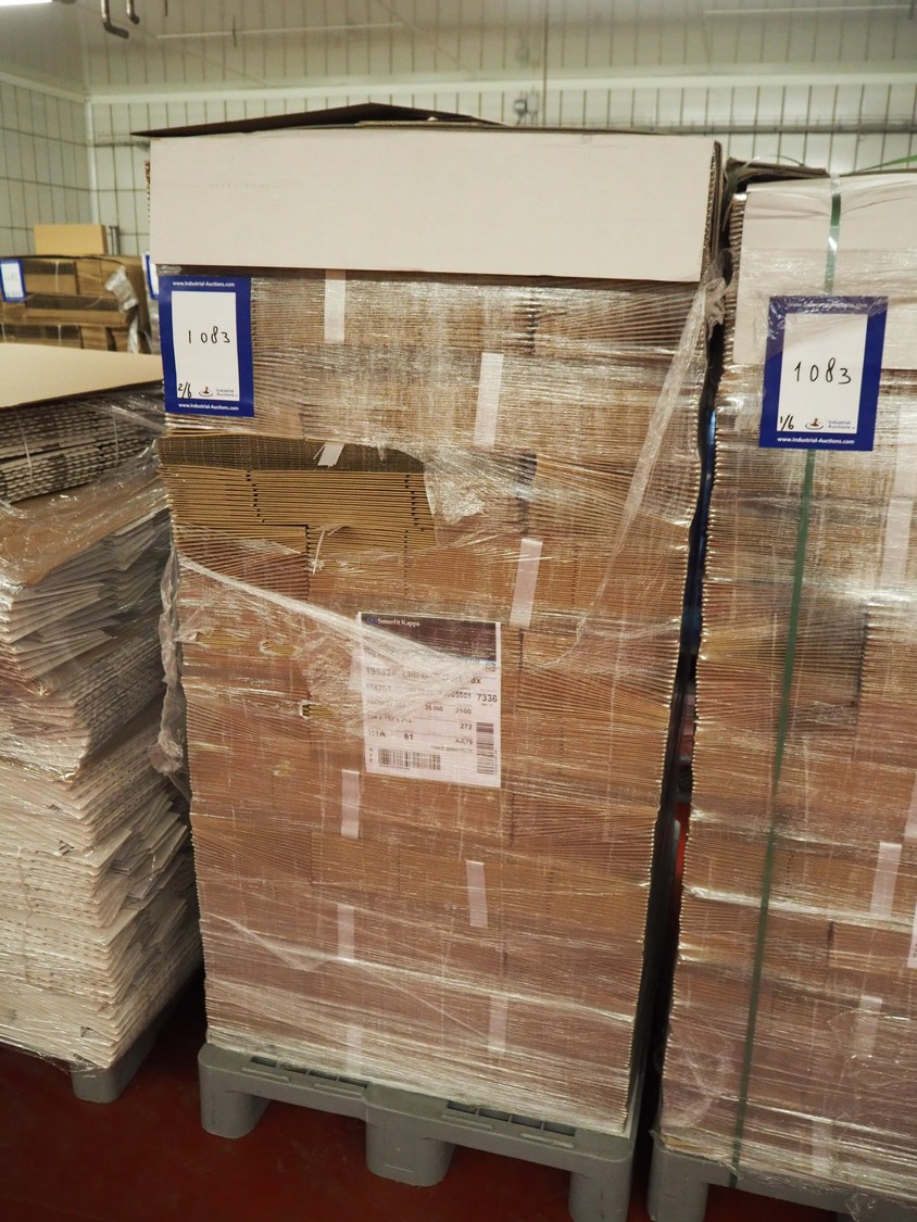 6 pallets with Smurfit Kappa carton boxes, dimensions boxes: (1x) 270 mm x 190 mm x 235 mm, (2x) 394 mm x 152 mm x 216 mm, (3x) 345 mm x 120 mm x 195 mm, total dimensions: (6x) 1200 mm x 800 mm x 1700 mm.