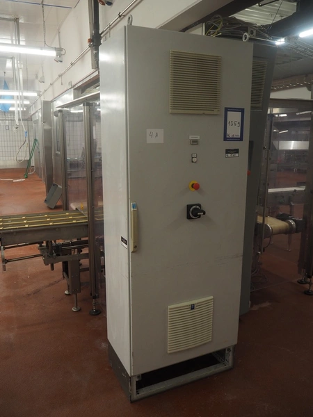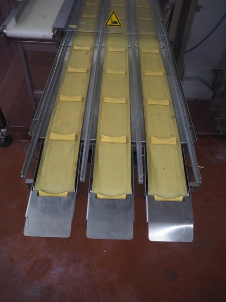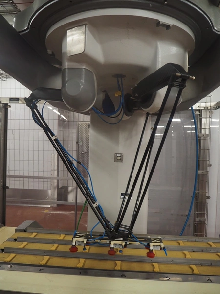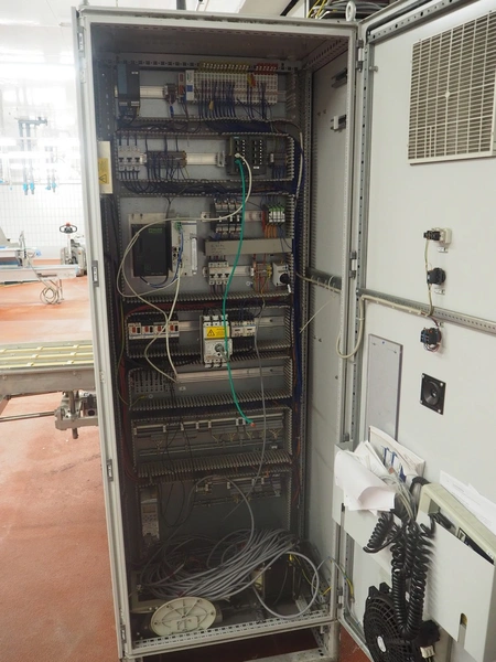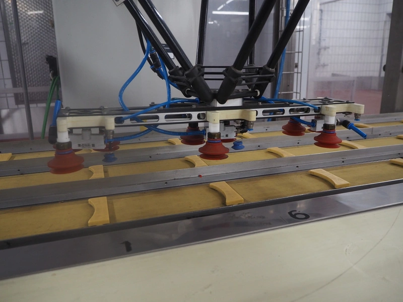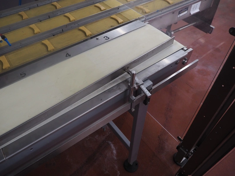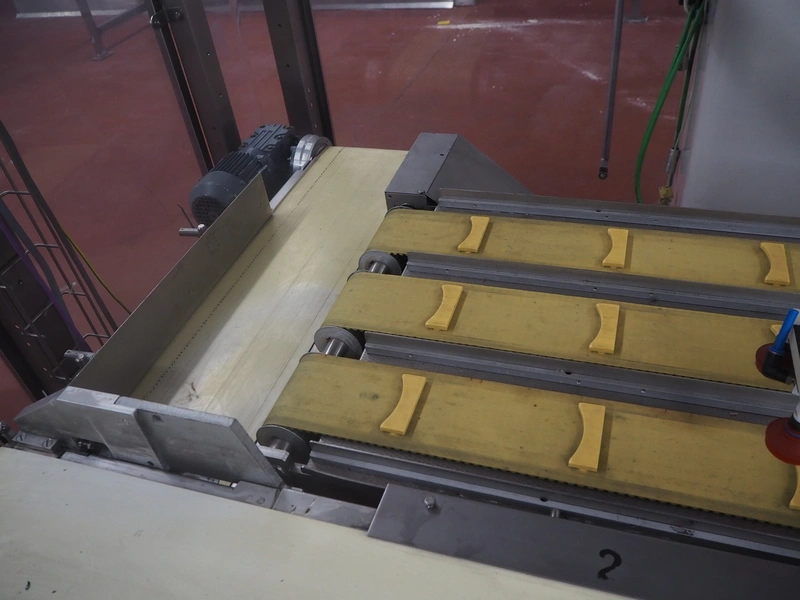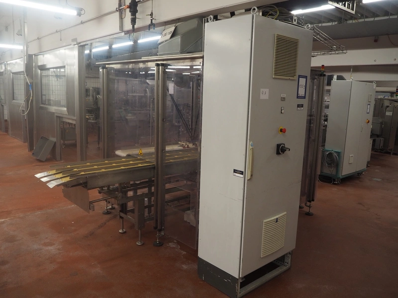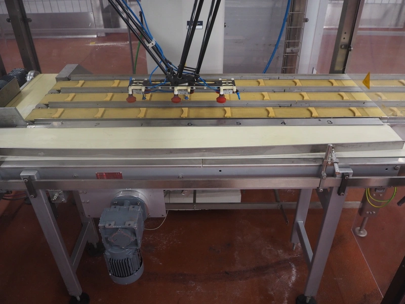 Bosch Sigpack Systems AG robot line dividing machine, type: LDM and TC1-XP, number: J-01659-LDM-042 and TC02075 / J-01659-TRV, year of construction: 2008, plastic infeed belt with dividers, belt width: 120 mm, distance between dividers: 190 mm, divider height: 7 mm, plastic outfeed belts, belt width: 250 mm, total dimensions: 2400 mm x 2400 mm x 2500 mm.