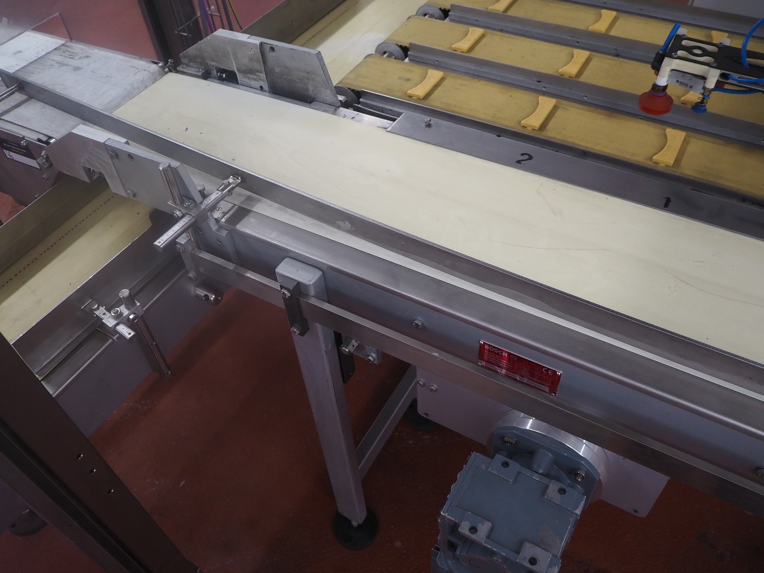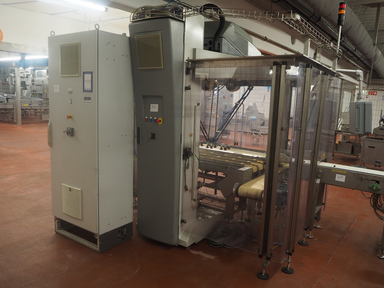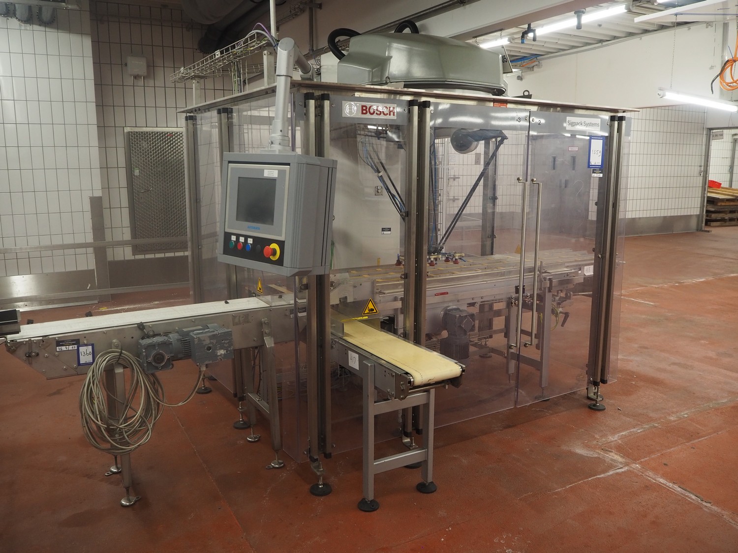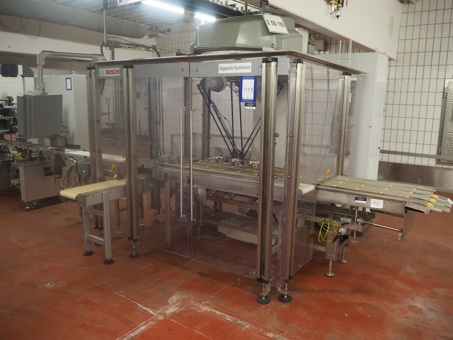 Bosch Sigpack Systems AG robot line dividing machine, type: LDM and TC1-XP, number: J-01659-LDM-042 and TC02075 / J-01659-TRV, year of construction: 2008, plastic infeed belt with dividers, belt width: 120 mm, distance between dividers: 190 mm, divider height: 7 mm, plastic outfeed belts, belt width: 250 mm, total dimensions: 2400 mm x 2400 mm x 2500 mm.