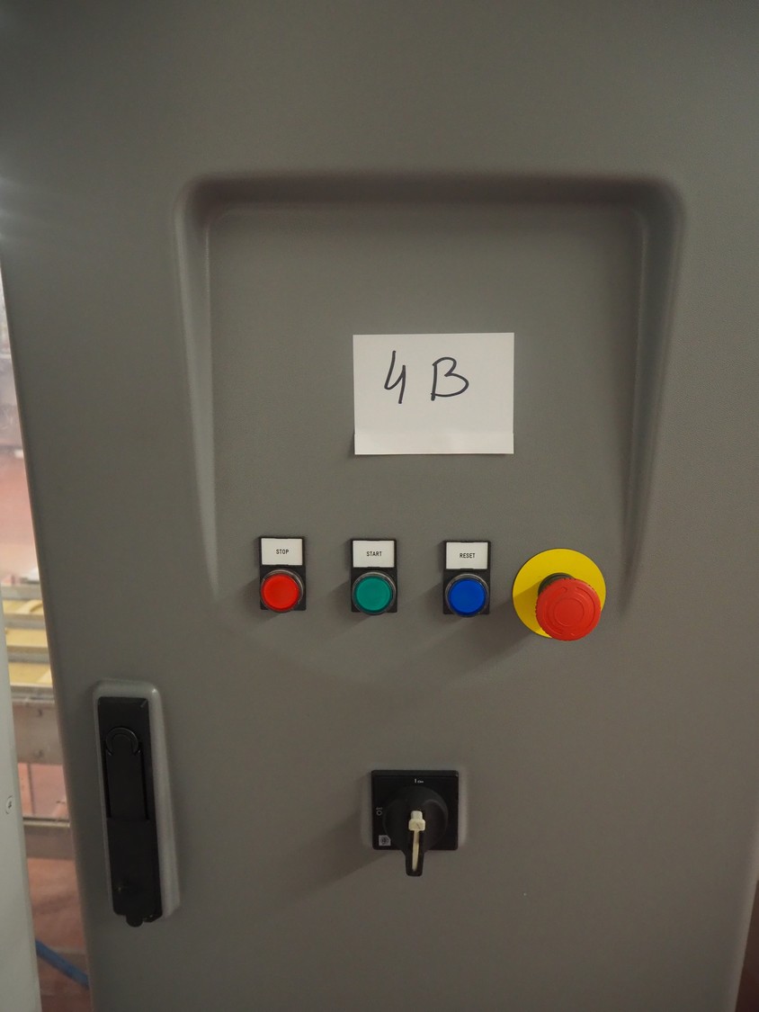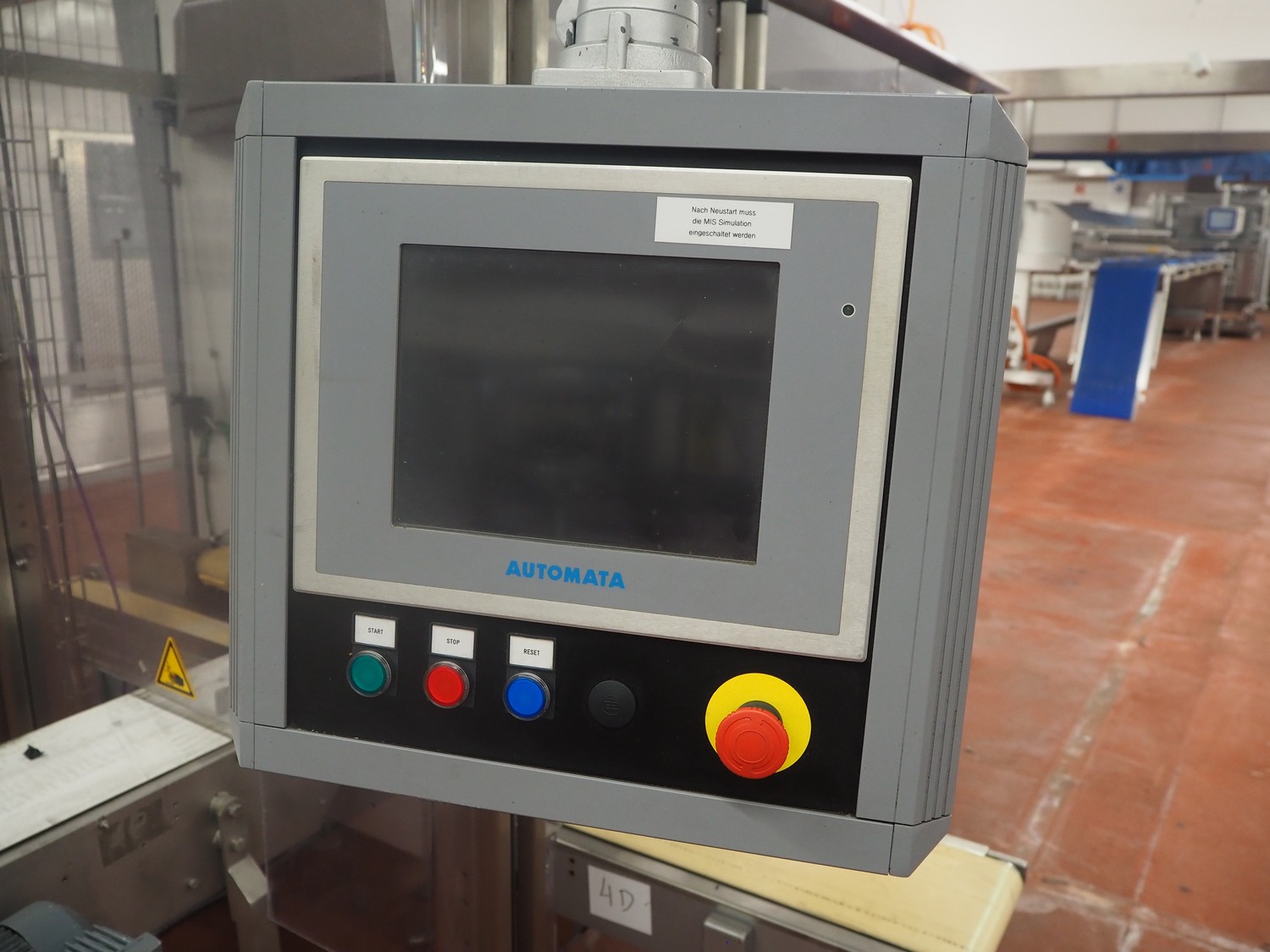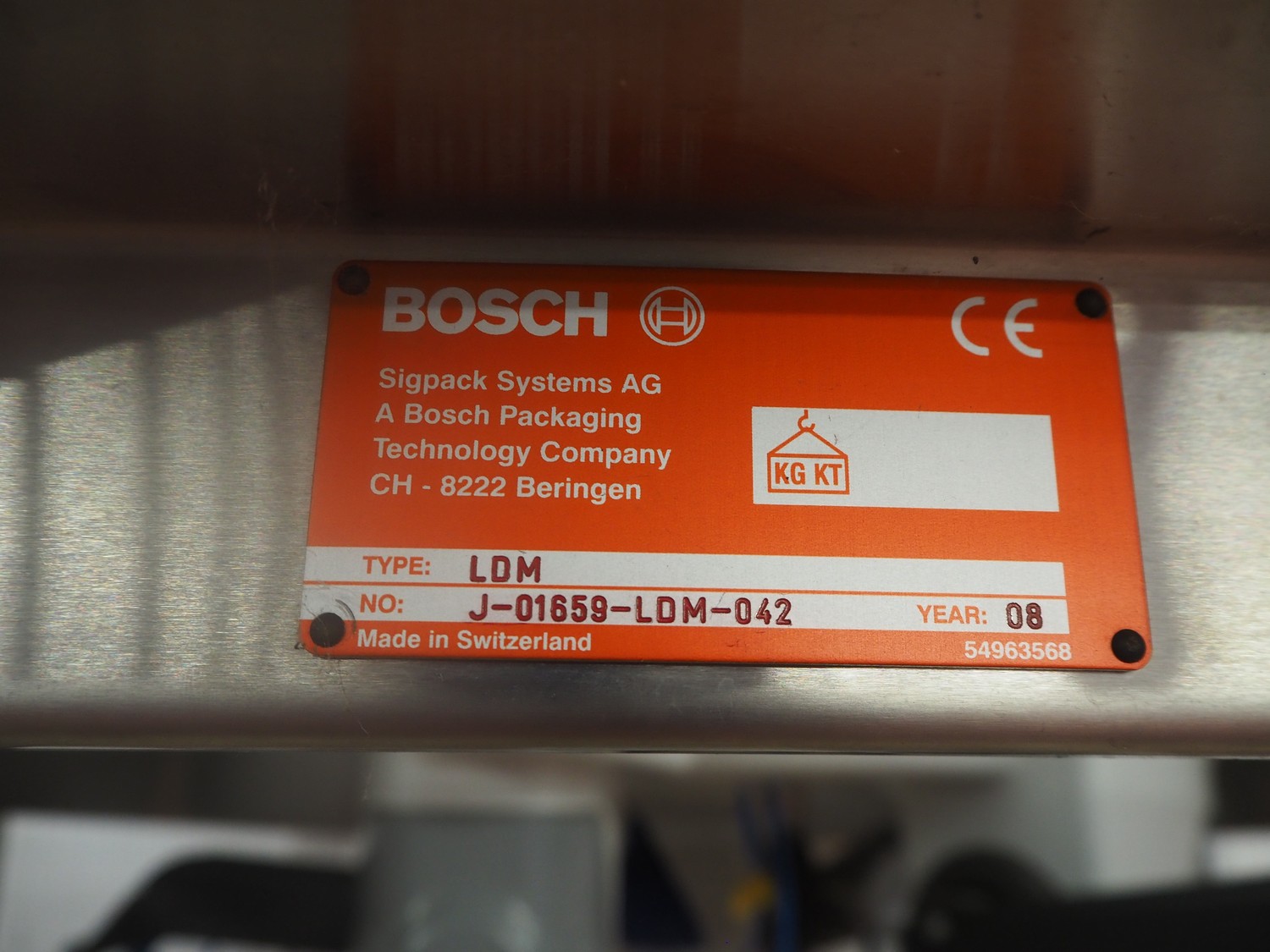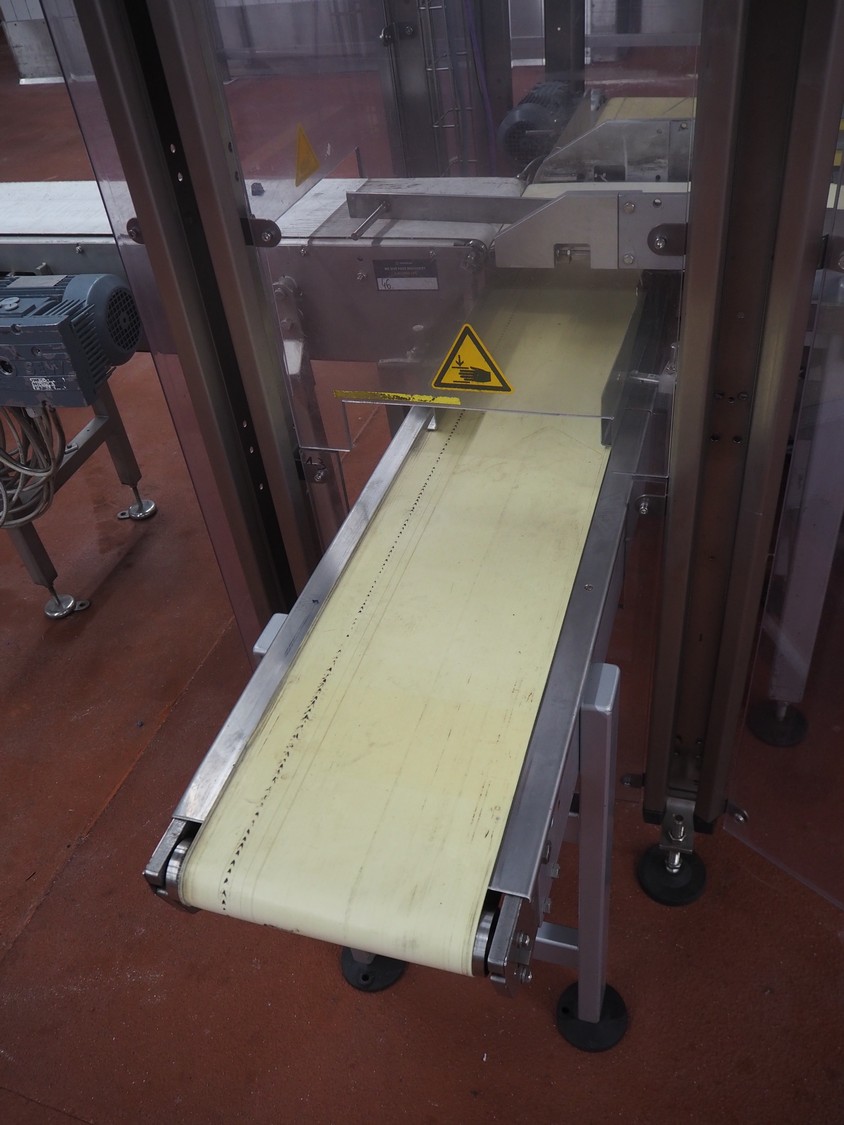 Bosch Sigpack Systems AG robot line dividing machine, type: LDM and TC1-XP, number: J-01659-LDM-042 and TC02075 / J-01659-TRV, year of construction: 2008, plastic infeed belt with dividers, belt width: 120 mm, distance between dividers: 190 mm, divider height: 7 mm, plastic outfeed belts, belt width: 250 mm, total dimensions: 2400 mm x 2400 mm x 2500 mm.