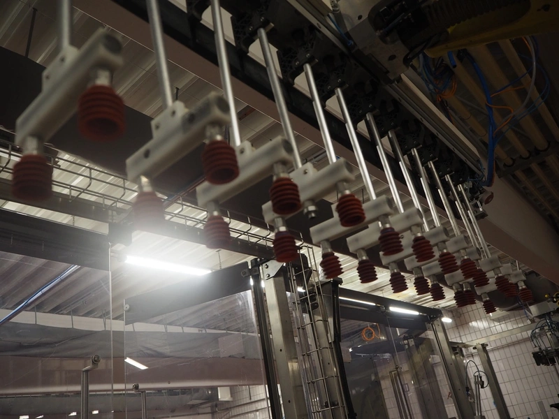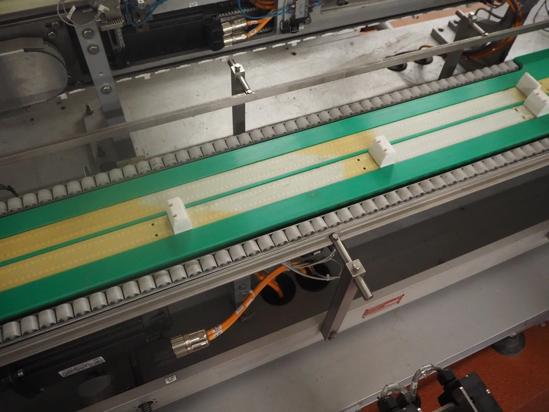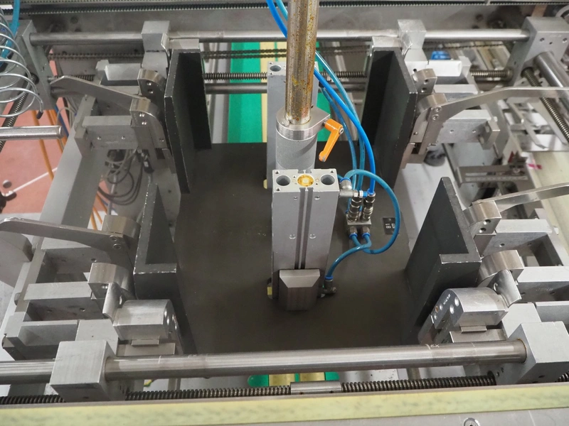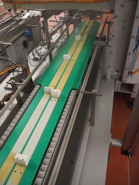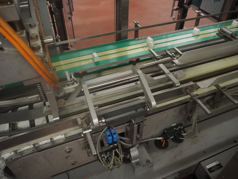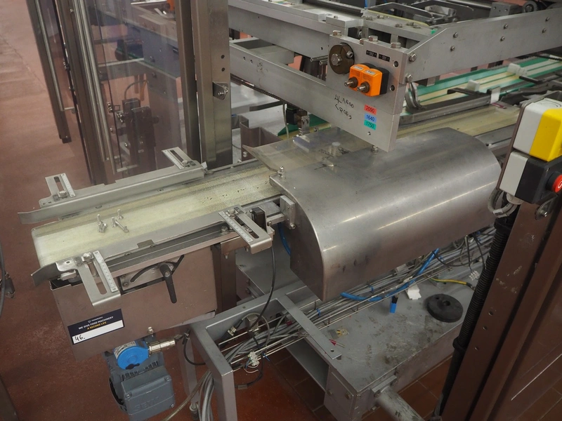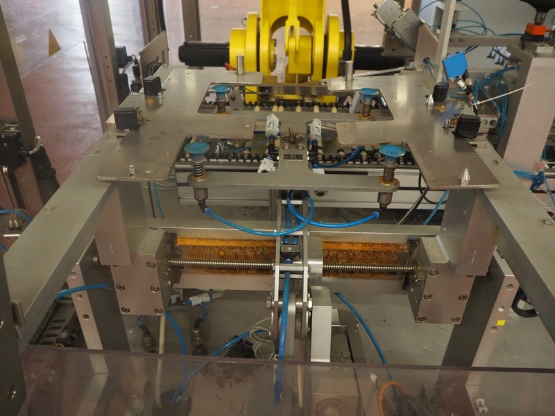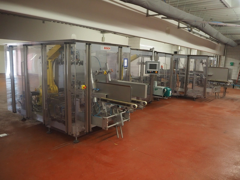 Bosch Sigpack Systems AG carton and lid erector with packaging robots, type: TTLi, number: J-01659-TTLi-077, year of construction: 2008, 2 packaging robots, Robatech glue unit, type: Concept A 8/6, plastic belts, belt width: (2x) 50 mm and 350 mm, total dimensions: 8500 mm x 4000 mm x 2000 mm.