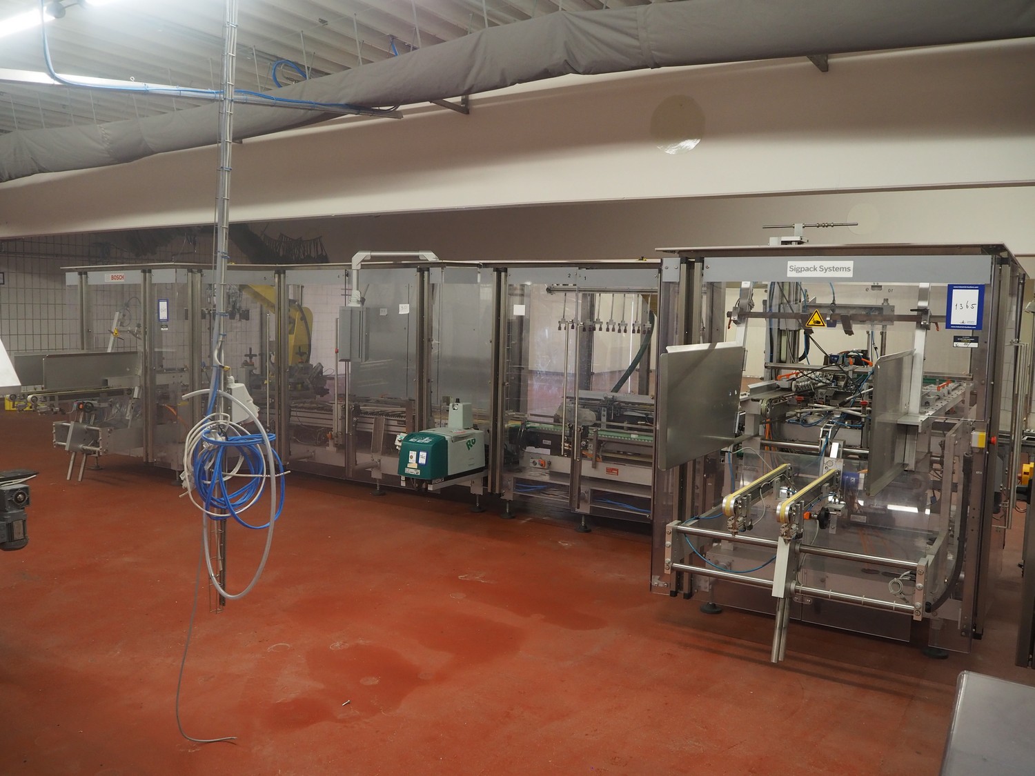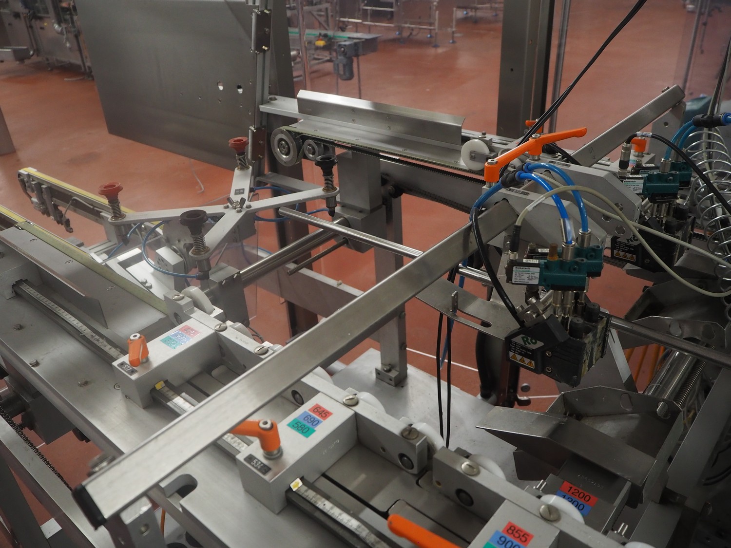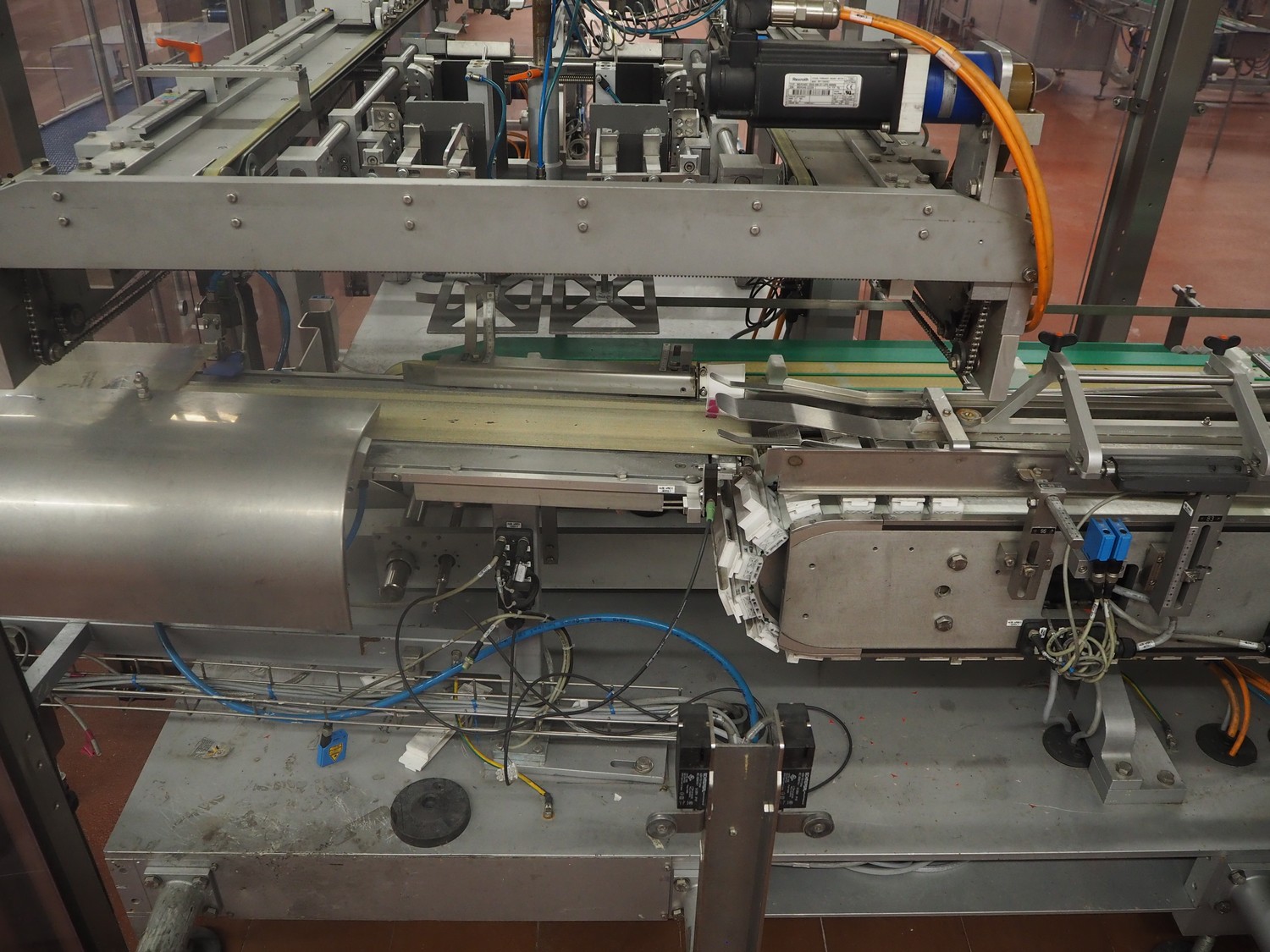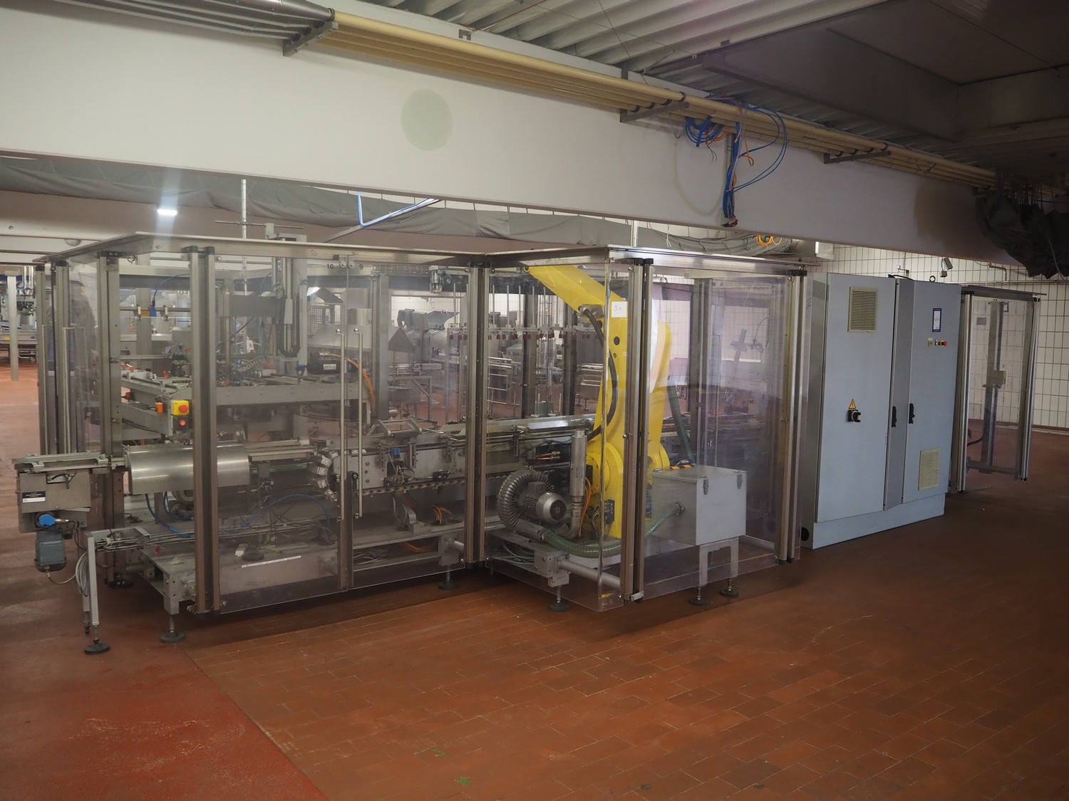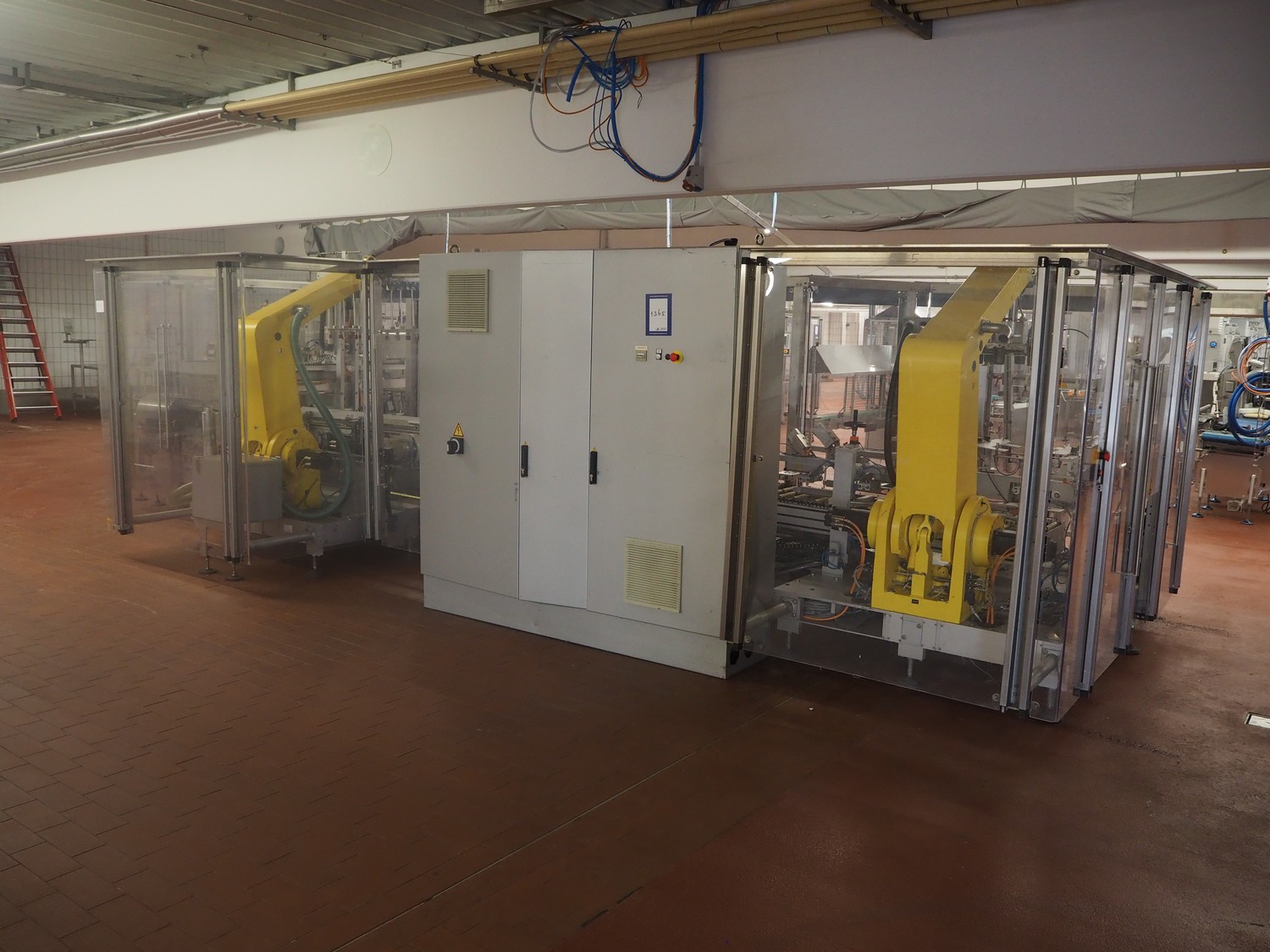 Bosch Sigpack Systems AG carton and lid erector with packaging robots, type: TTLi, number: J-01659-TTLi-077, year of construction: 2008, 2 packaging robots, Robatech glue unit, type: Concept A 8/6, plastic belts, belt width: (2x) 50 mm and 350 mm, total dimensions: 8500 mm x 4000 mm x 2000 mm.
