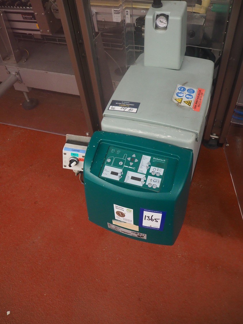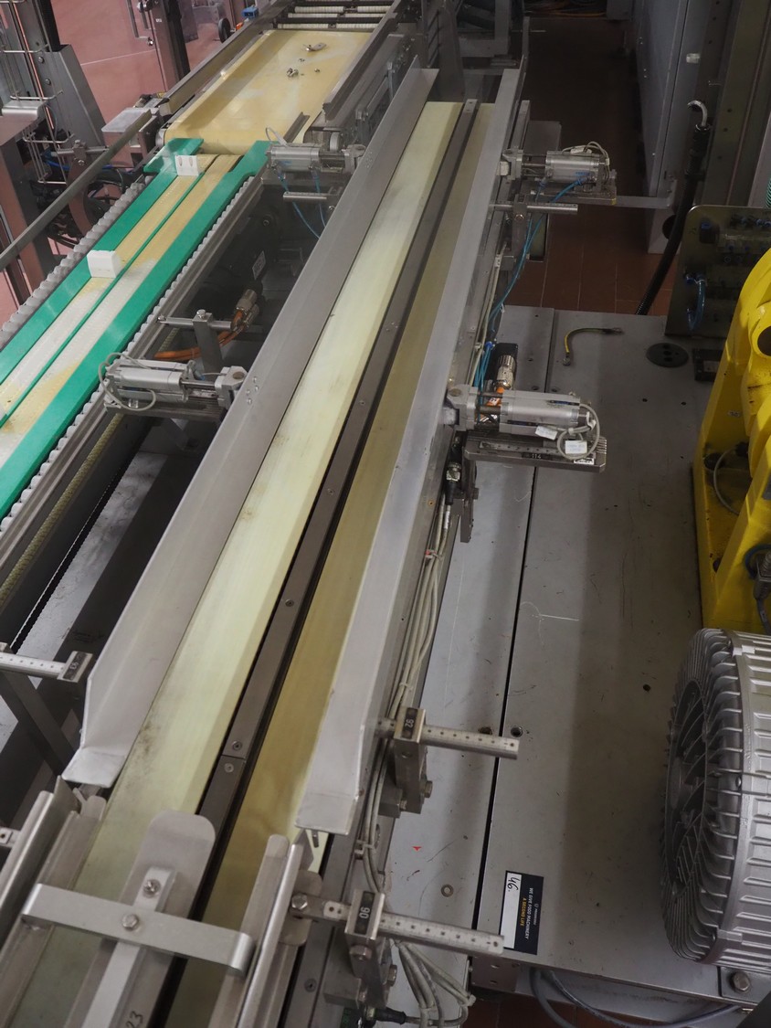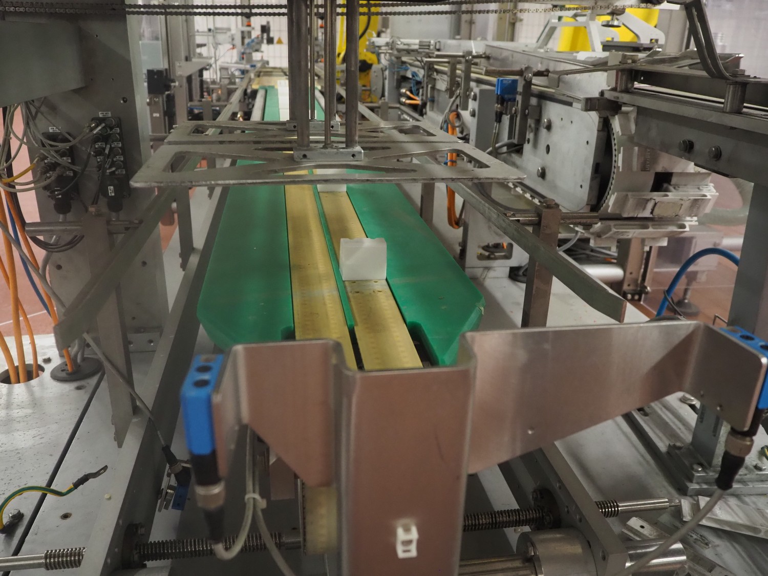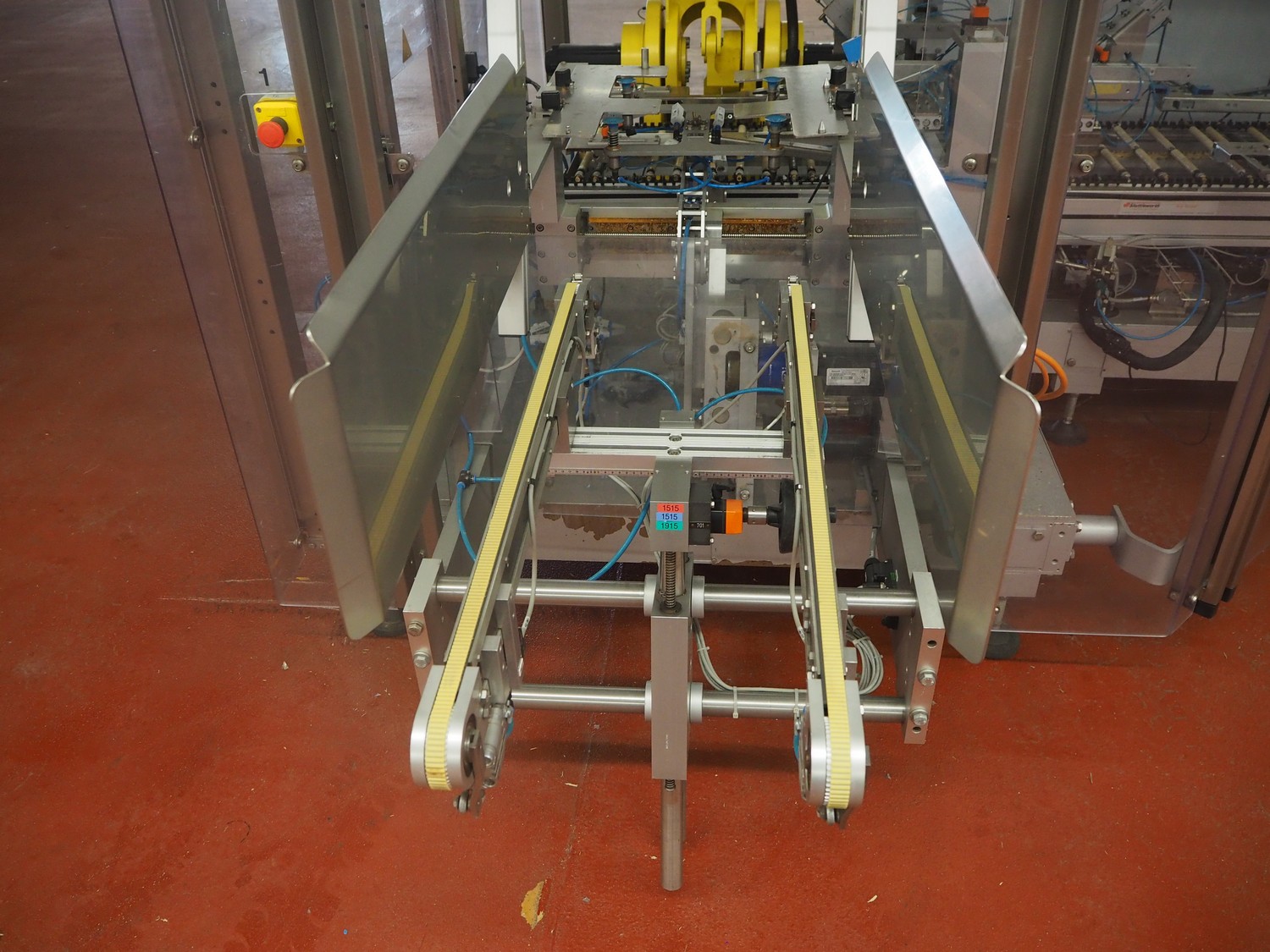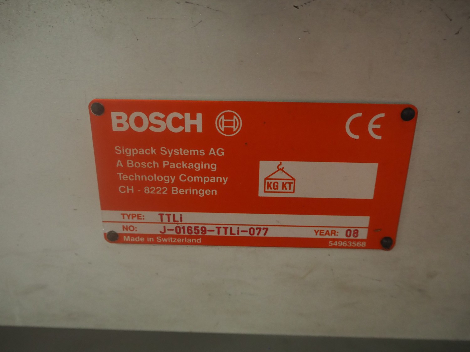 Bosch Sigpack Systems AG carton and lid erector with packaging robots, type: TTLi, number: J-01659-TTLi-077, year of construction: 2008, 2 packaging robots, Robatech glue unit, type: Concept A 8/6, plastic belts, belt width: (2x) 50 mm and 350 mm, total dimensions: 8500 mm x 4000 mm x 2000 mm.