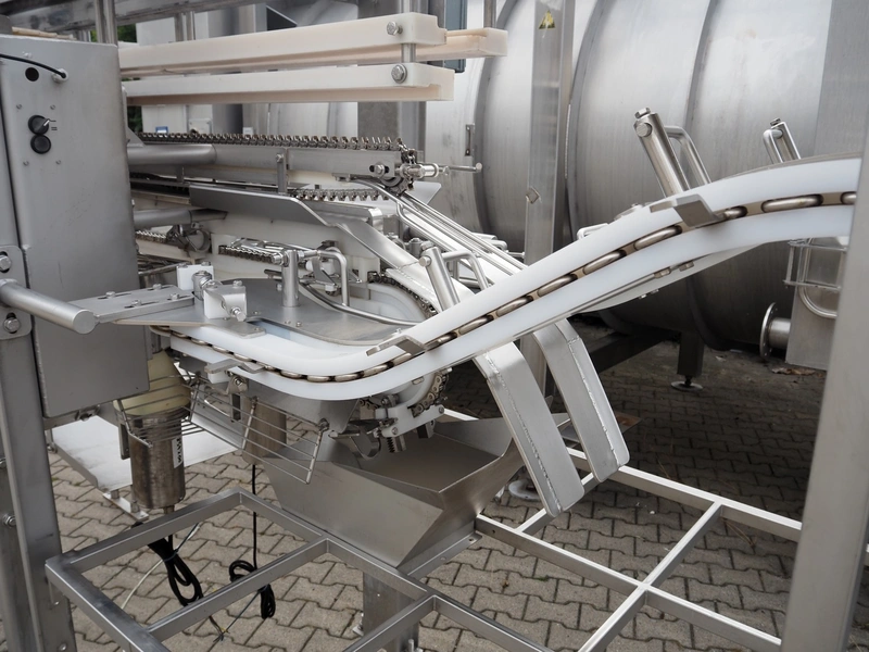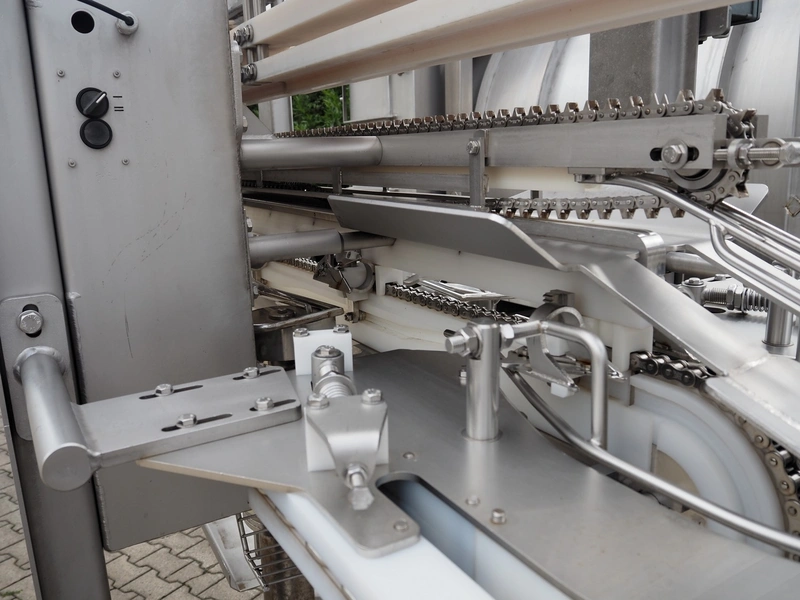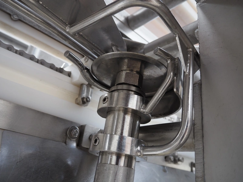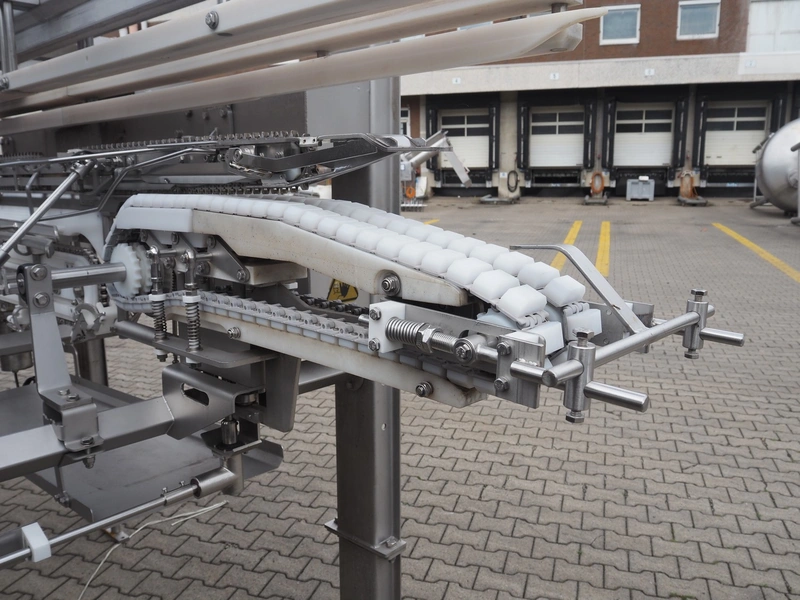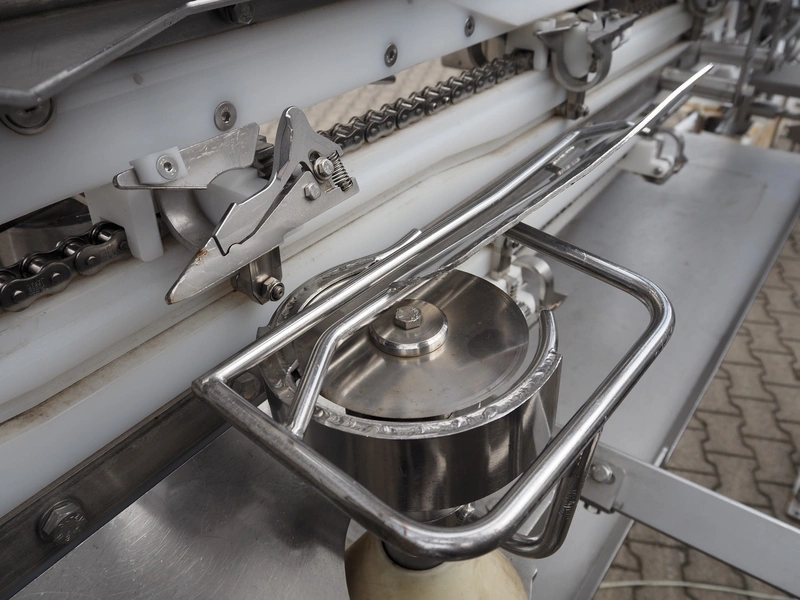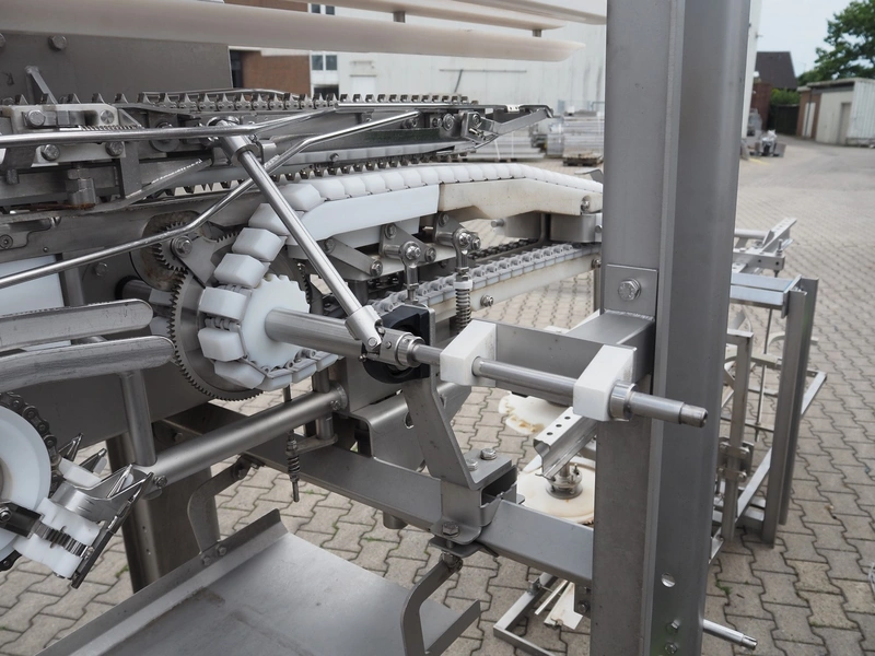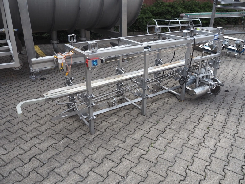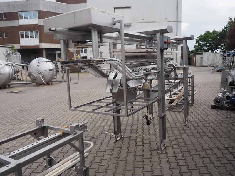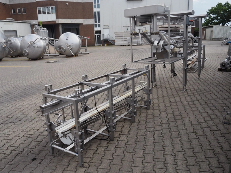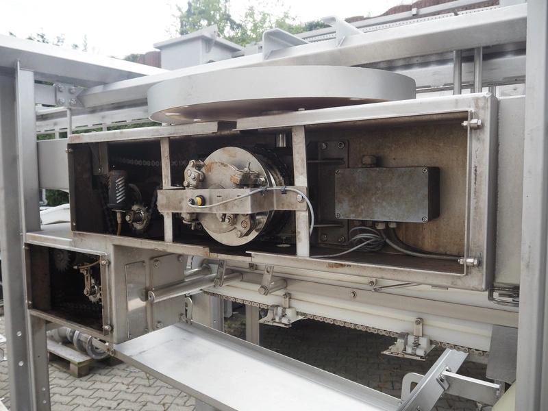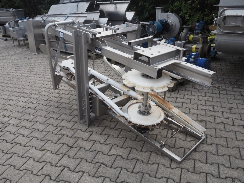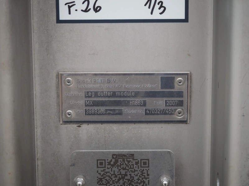 Stork leg cutter, model: MX H1863, type: 3989366, serial number: 470327/450, year of construction: 2007, s/s chain conveyor, total dimensions: (1x) 4750 mm x 1100 mm x 2200 mm, (1x) 3000 mm x 1000 mm x 1050 mm, (1x) 2600 mm x 800 mm x 1100 mm.