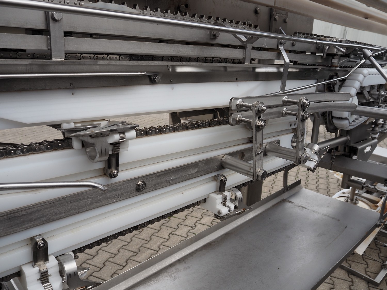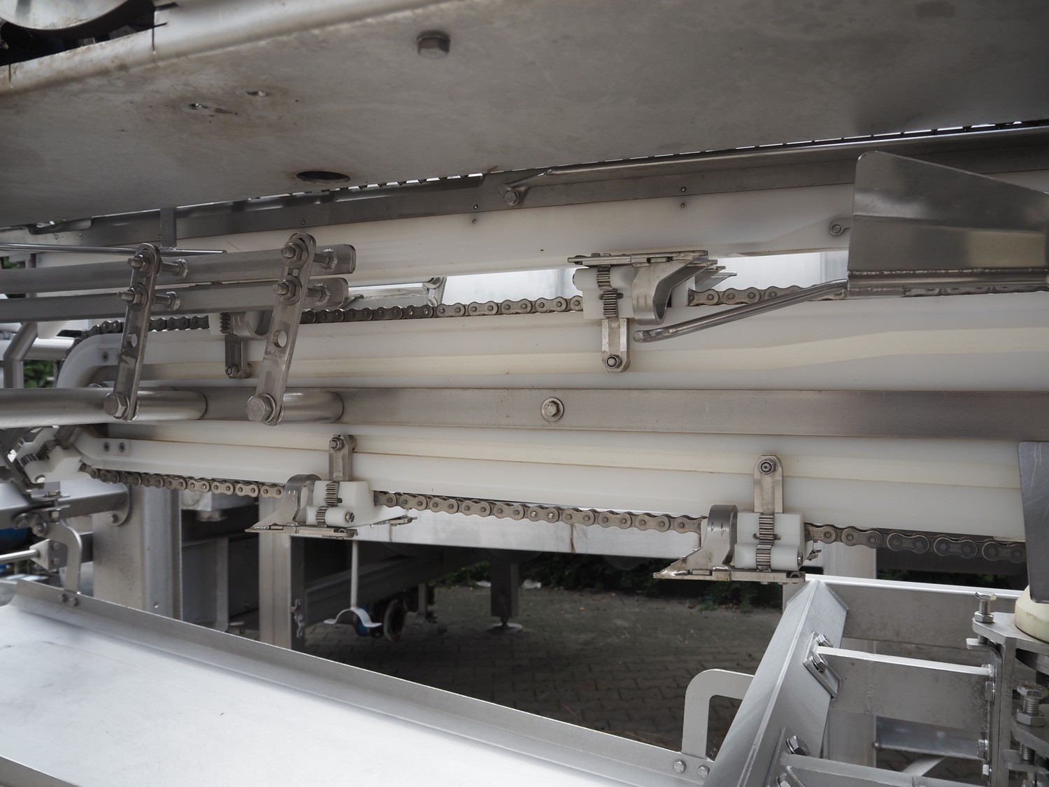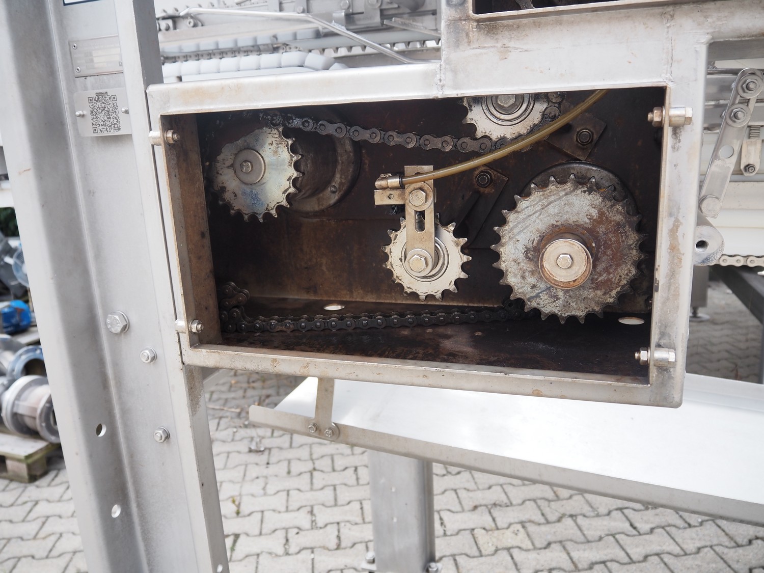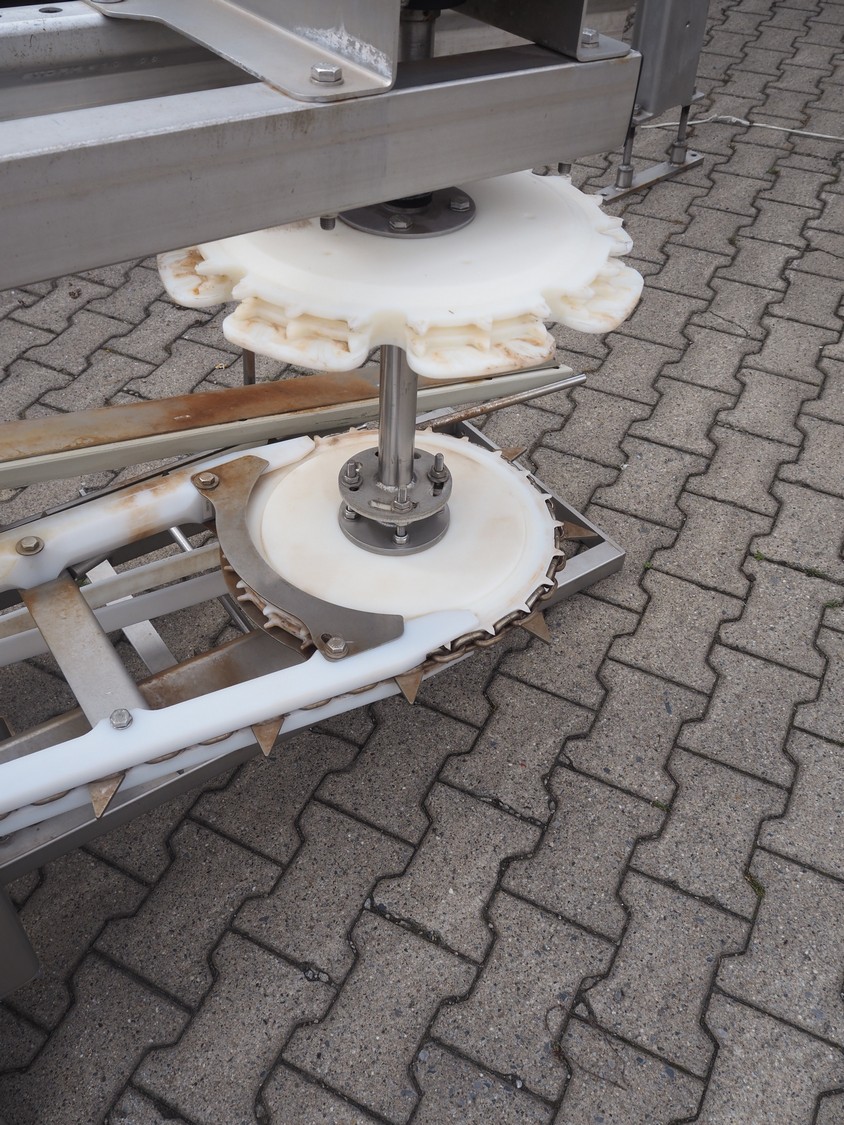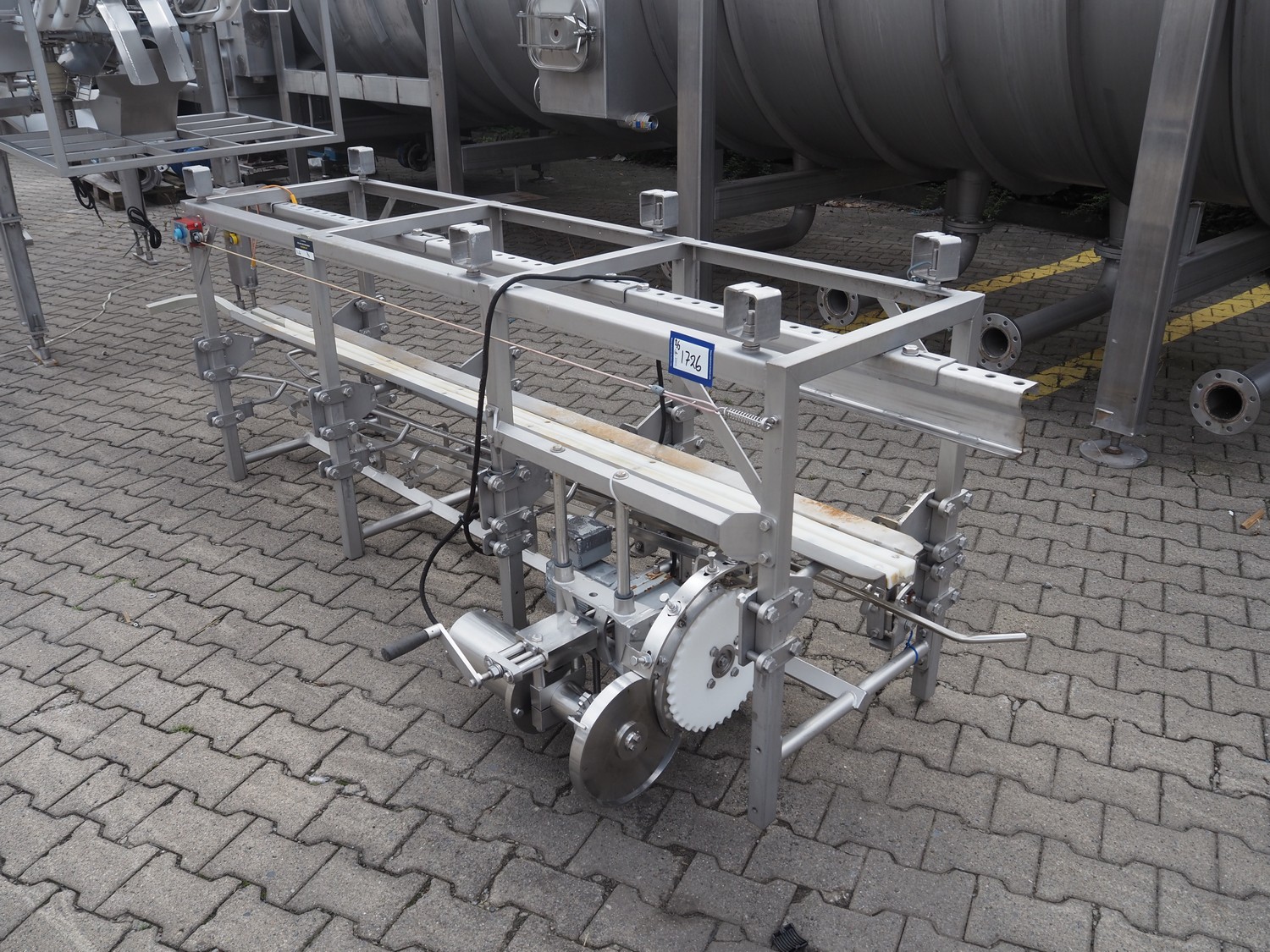 Stork leg cutter, model: MX H1863, type: 3989366, serial number: 470327/450, year of construction: 2007, s/s chain conveyor, total dimensions: (1x) 4750 mm x 1100 mm x 2200 mm, (1x) 3000 mm x 1000 mm x 1050 mm, (1x) 2600 mm x 800 mm x 1100 mm.