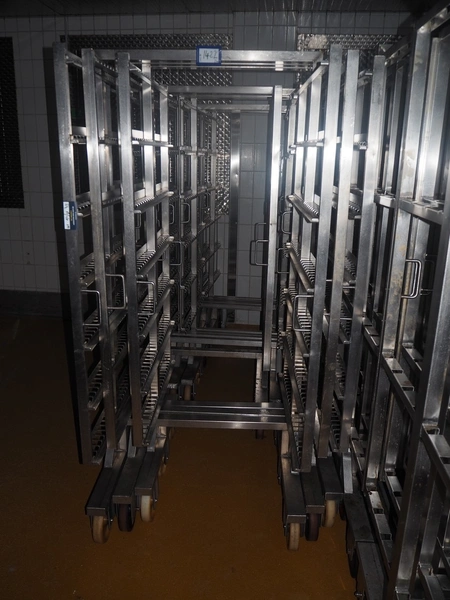 13 s/s H-profile smoke trolleys, 4 floors, dimensions each floor: 920 mm x 870 mm, total dimensions: (13x) 920 mm x 920 mm x 2100 mm.
