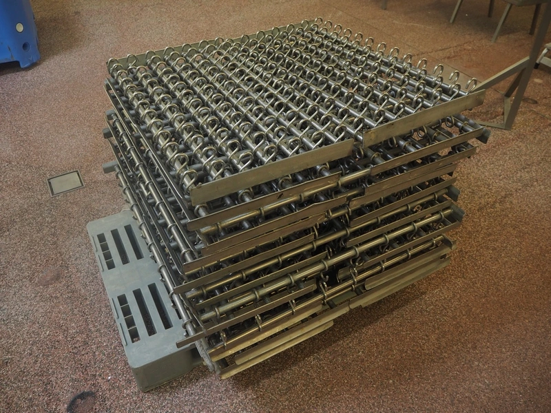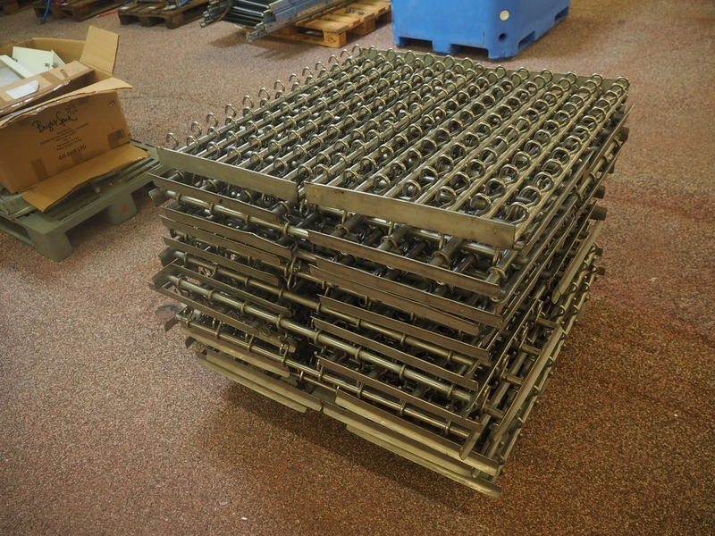 Pallet with large amount of s/s hangers for smoke trolleys, plate width: 940 mm, total dimensions: 1200 mm x 950 mm x 900 mm.