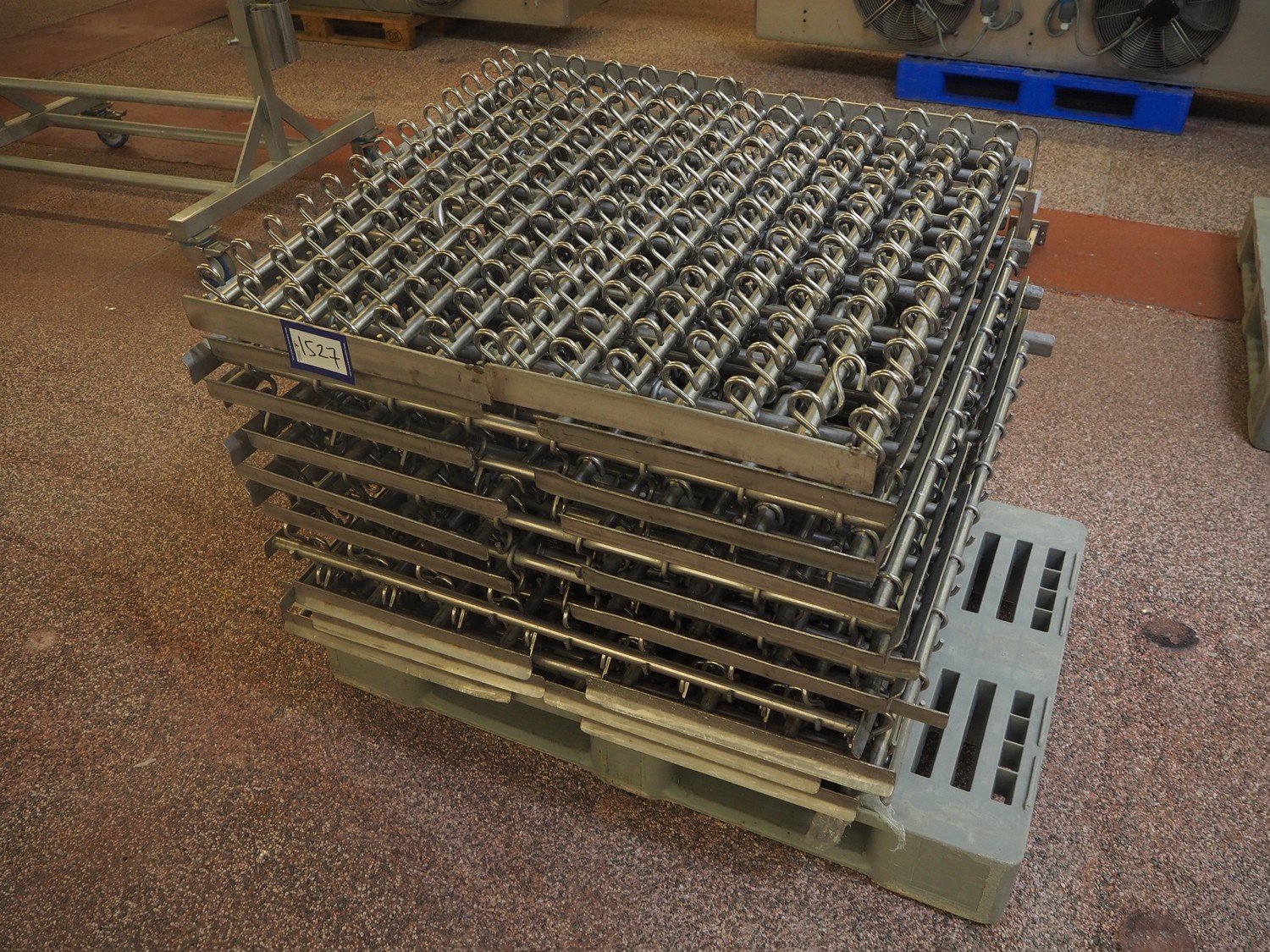 Pallet with large amount of s/s hangers for smoke trolleys, plate width: 940 mm, total dimensions: 1200 mm x 950 mm x 900 mm.