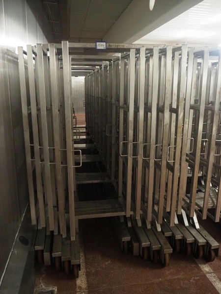 35 s/s H-profile smoke trolleys, 4 floors, floor dimensions: 920 mm x 870 mm, total dimensions: (35x) 920 mm x 920 mm x 2100 mm.