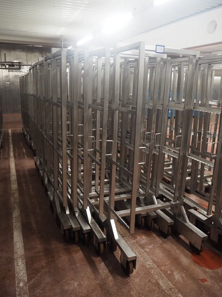35 s/s H-profile smoke trolleys, 4 floors, floor dimensions: 920 mm x 870 mm, total dimensions: (35x) 920 mm x 920 mm x 2100 mm.