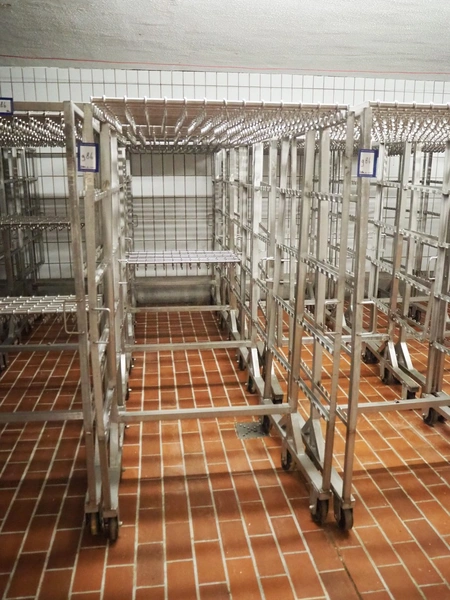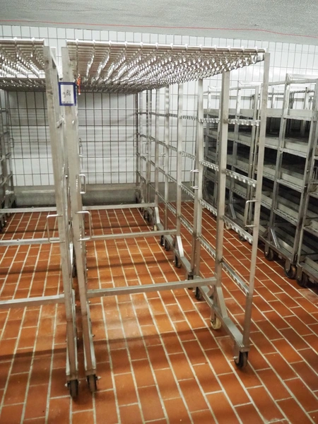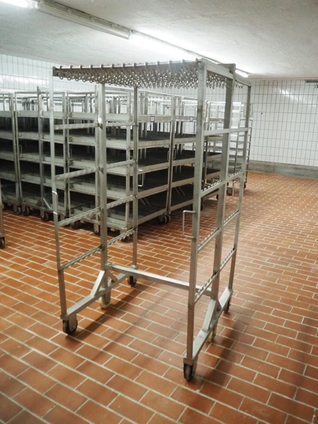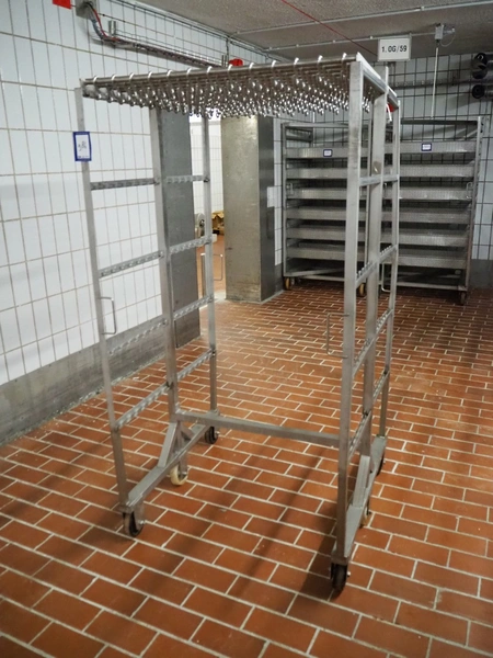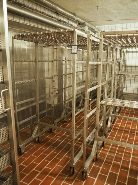 20 s/s smoke trolleys with hangers, 5 floors each, dimensions each floor: 1000 mm x 970 mm, total dimensions: (20x) 1010 mm x 980 mm x 1830 mm.
