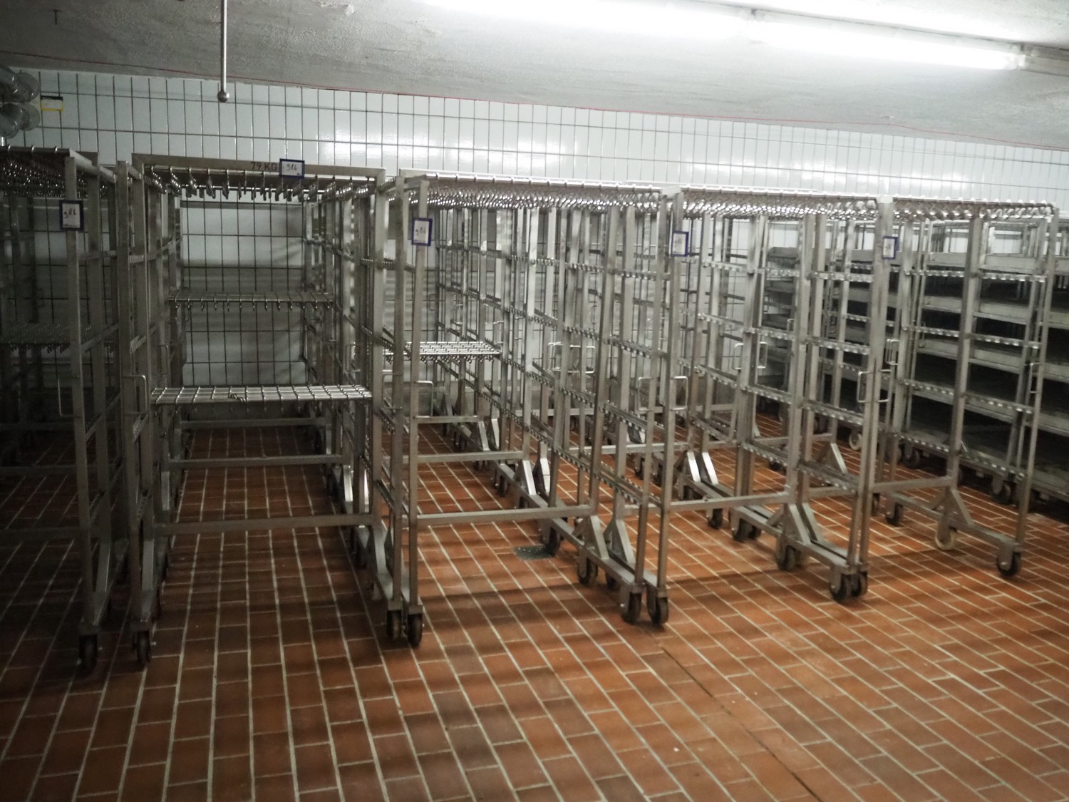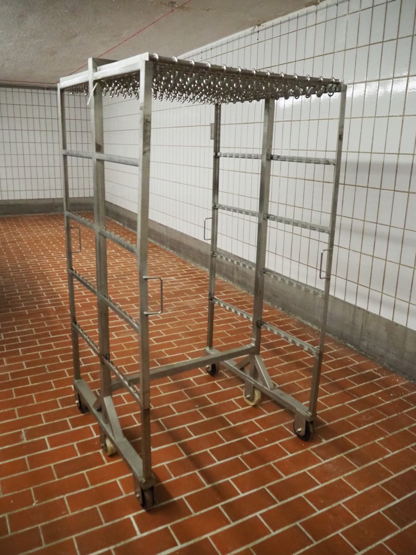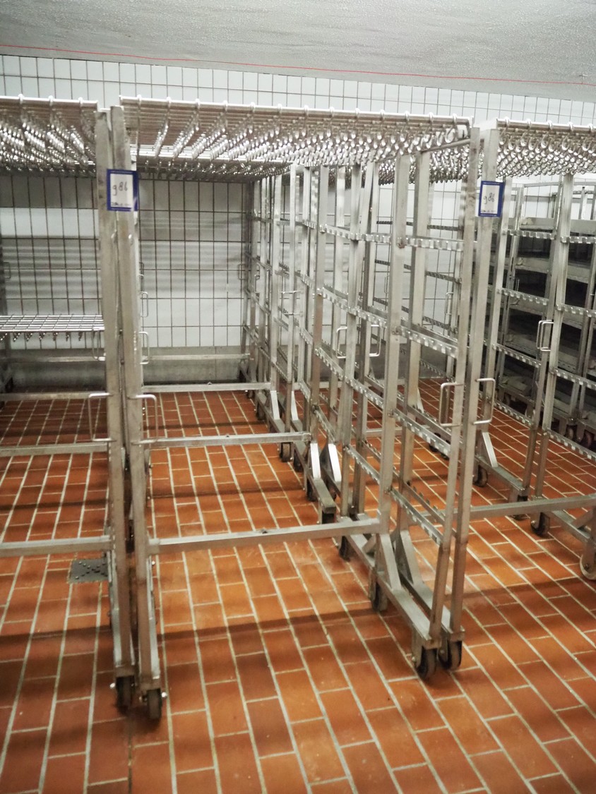 20 s/s smoke trolleys with hangers, 5 floors each, dimensions each floor: 1000 mm x 970 mm, total dimensions: (20x) 1010 mm x 980 mm x 1830 mm.