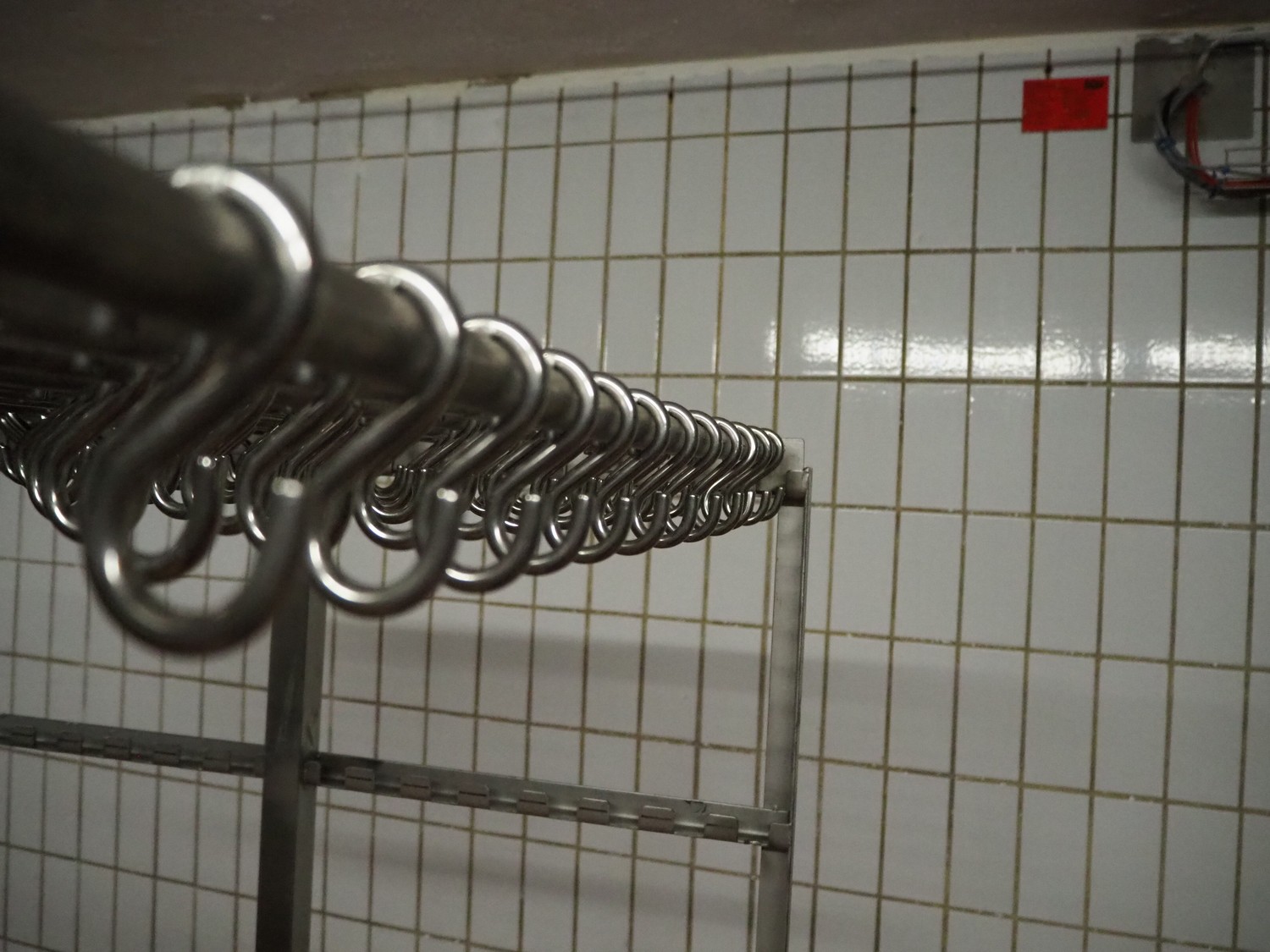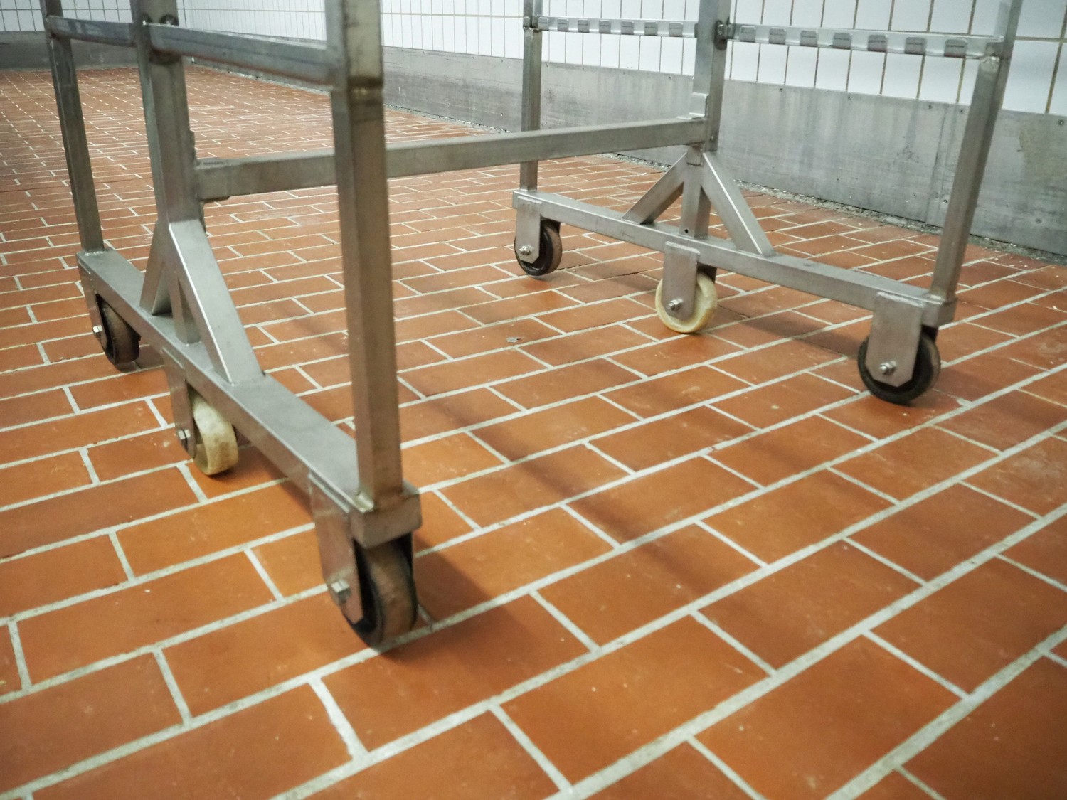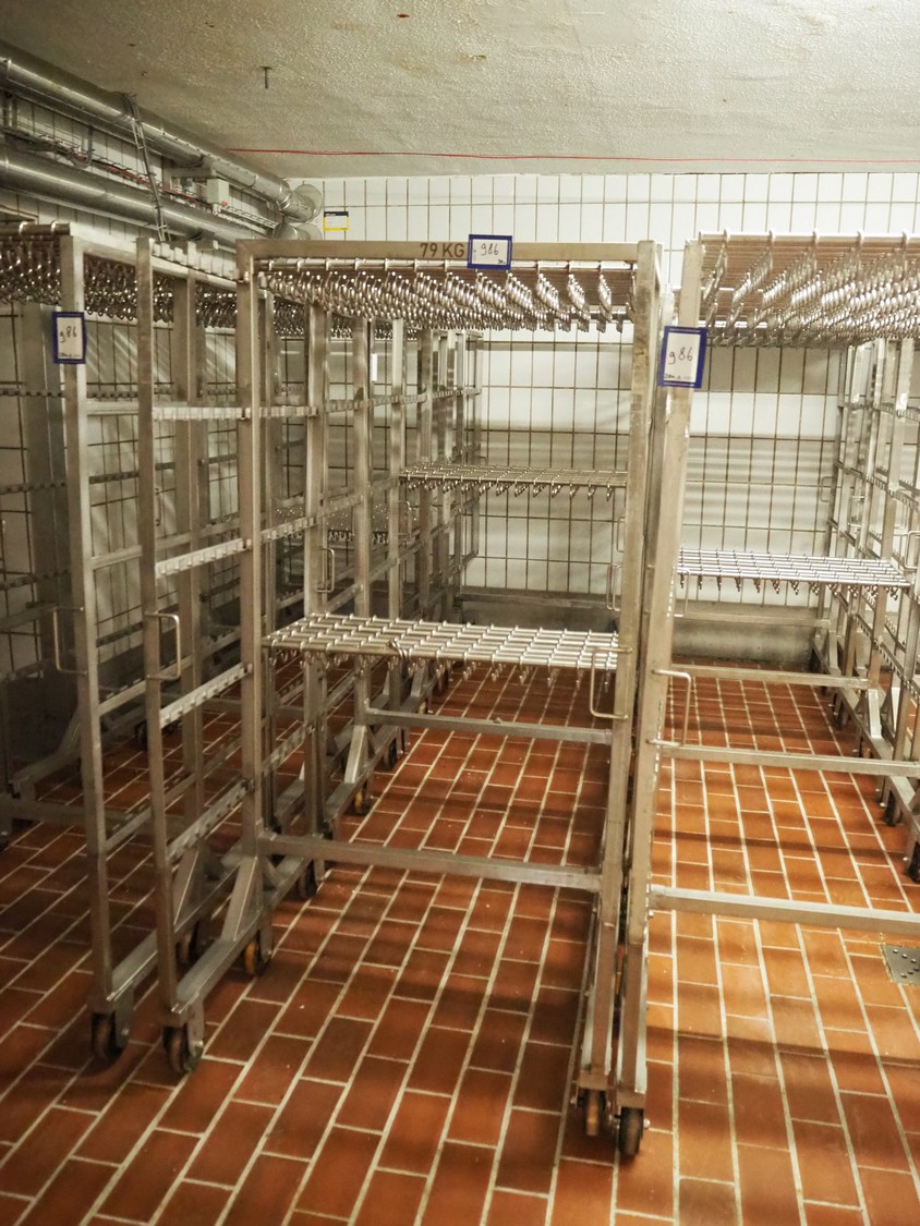 20 s/s smoke trolleys with hangers, 5 floors each, dimensions each floor: 1000 mm x 970 mm, total dimensions: (20x) 1010 mm x 980 mm x 1830 mm.