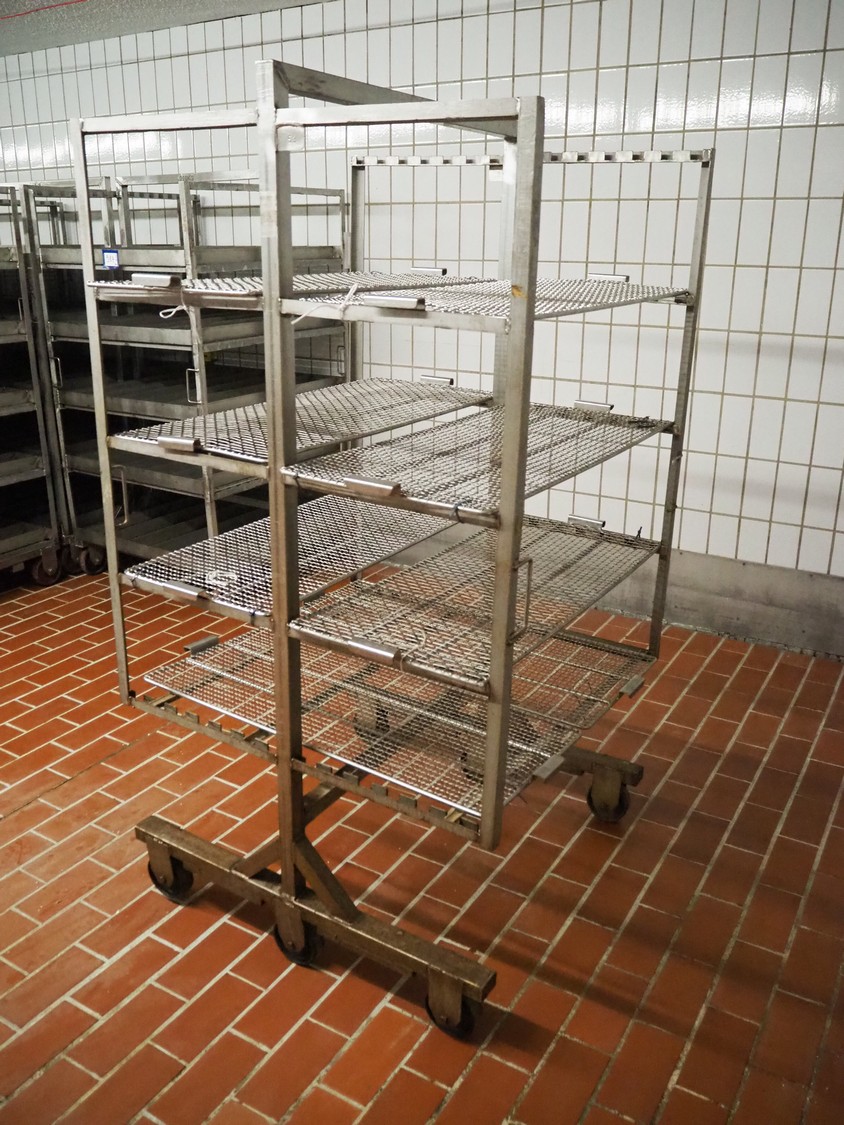S/s smoke trolley, 5 floors with 8 plates, dimensions each floor: 1010 mm x 970 mm, total dimensions: 1020 mm x 980 mm x 1880 mm.