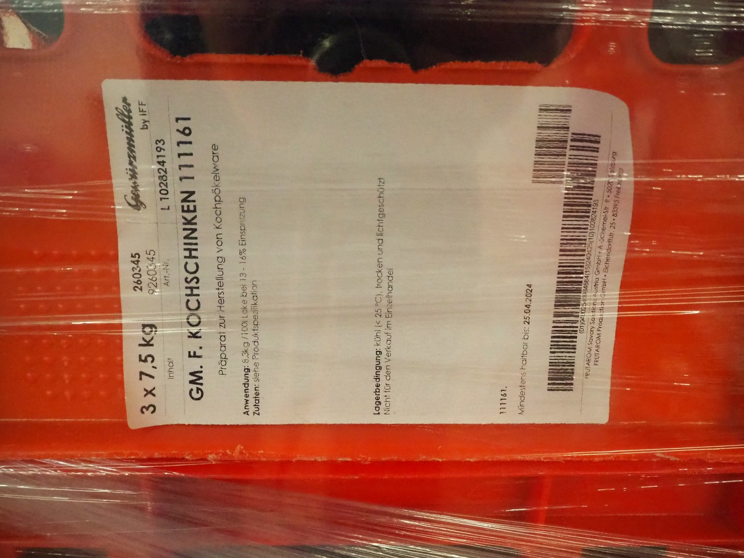16 pallets with AVO-Werke, Gewürzmüller and Van Hees spices for meat salad and Kochschinken, total dimensions: (7x) 1200 mm x 800 mm x 1500 mm, (7x) 1200 mm x 800 mm x 1300 mm and (2x) 1200 mm x 800 mm x 920 mm.
