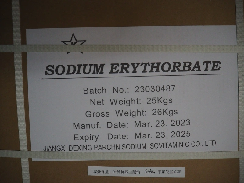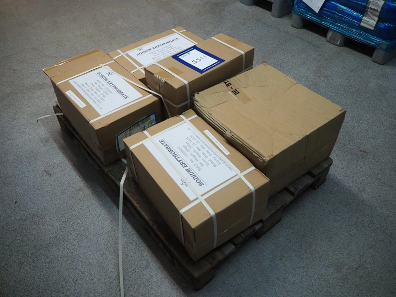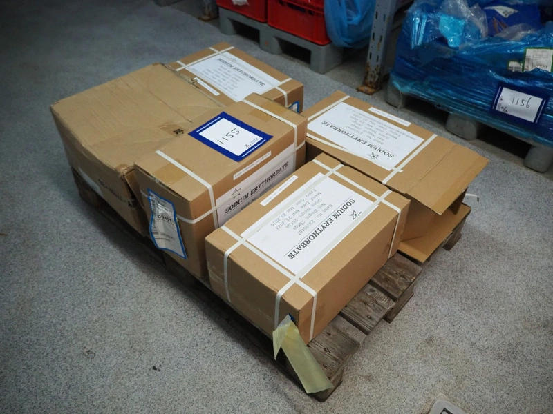 Pallet with Jiangxi Dexing sodium erythorbate, best before: 23-03-2025, dimensions: 1200 mm x 800 mm x 580 mm.
