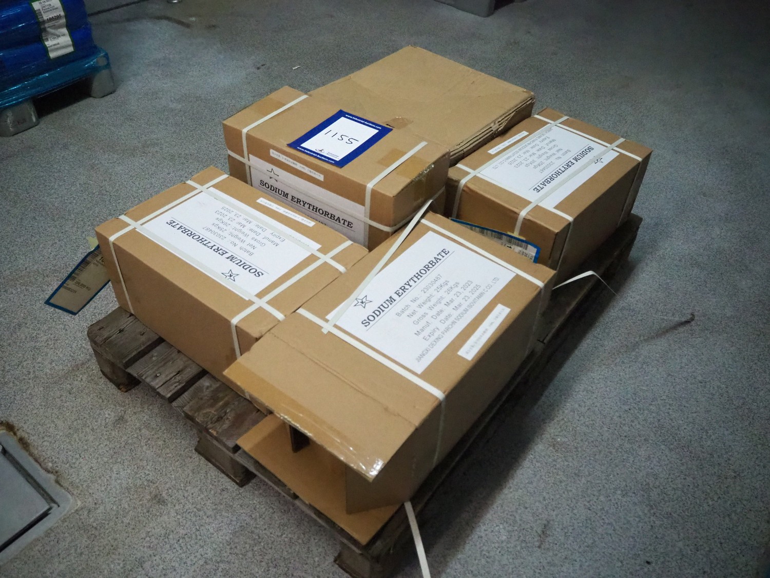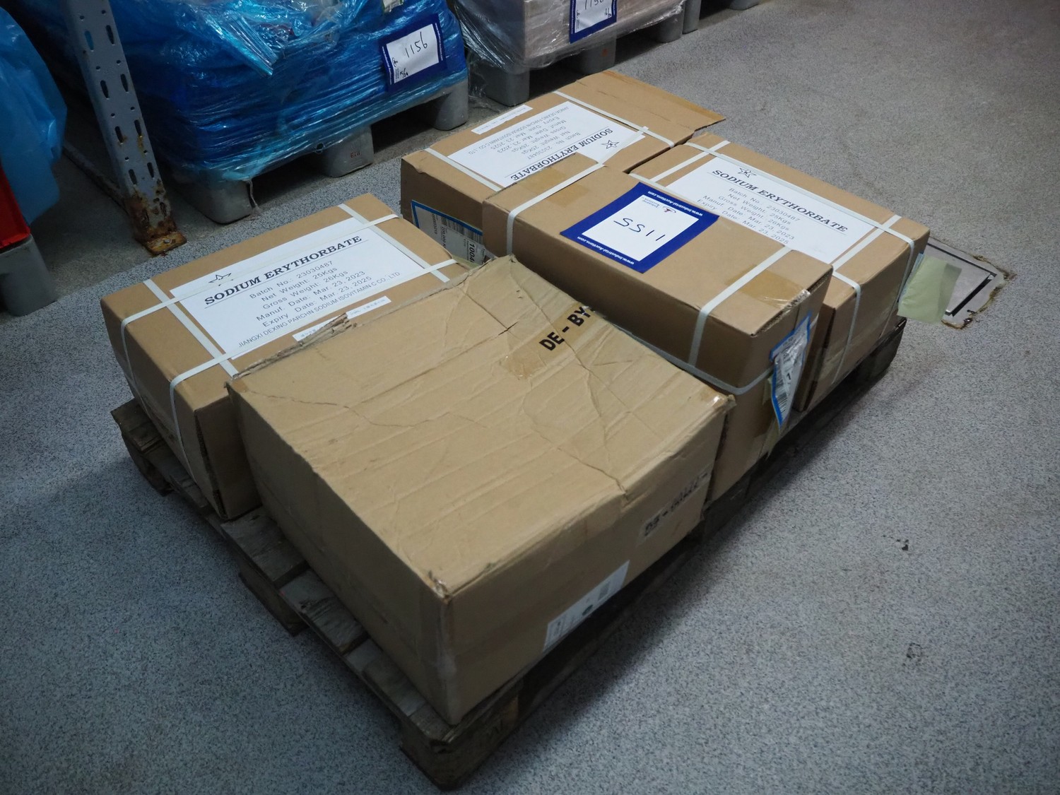 Pallet with Jiangxi Dexing sodium erythorbate, best before: 23-03-2025, dimensions: 1200 mm x 800 mm x 580 mm.