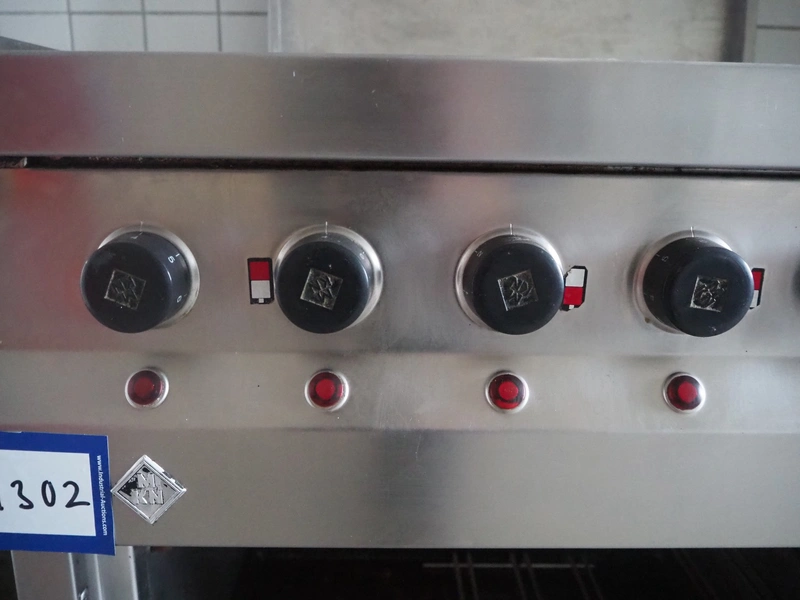 MKN electrical 4-pits stove with oven, type: 27623, machine number: 01106, 380 V, 3 Ph, 4 floors oven, dimensions each floor: 520 mm x 300 mm, total dimensions: 800 mm x 870 mm x 900 mm.