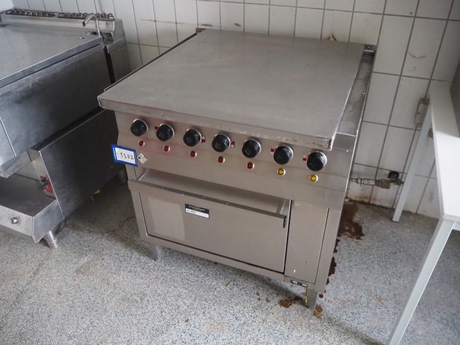 MKN electrical 4-pits stove with oven, type: 27623, machine number: 01106, 380 V, 3 Ph, 4 floors oven, dimensions each floor: 520 mm x 300 mm, total dimensions: 800 mm x 870 mm x 900 mm.