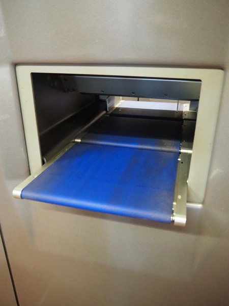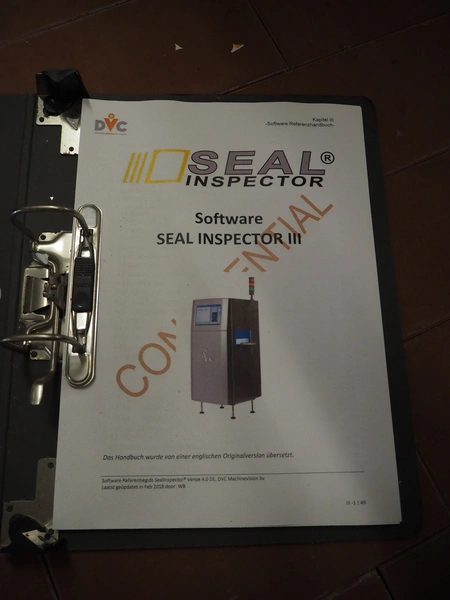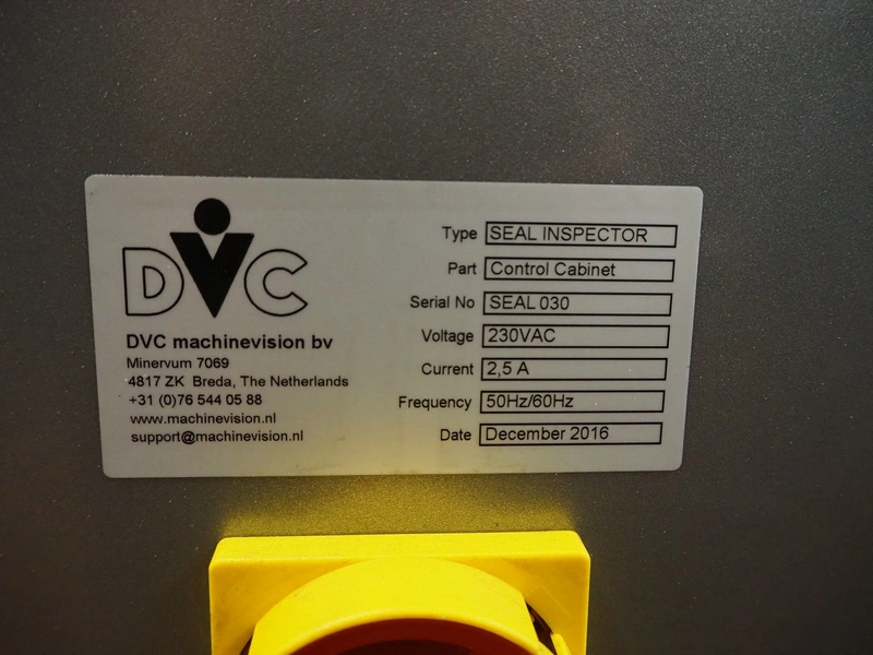 DVC seal inspection machine, type: Seal Inspector, serial number: SEAL030, year of construction: December 2016, 230 V, 50/60 Hz, 2.5 A, plastic belt, belt width: 245 mm, clearance: 285 mm x 200 mm, total dimensions: 800 mm x 800 mm x 1850 mm.