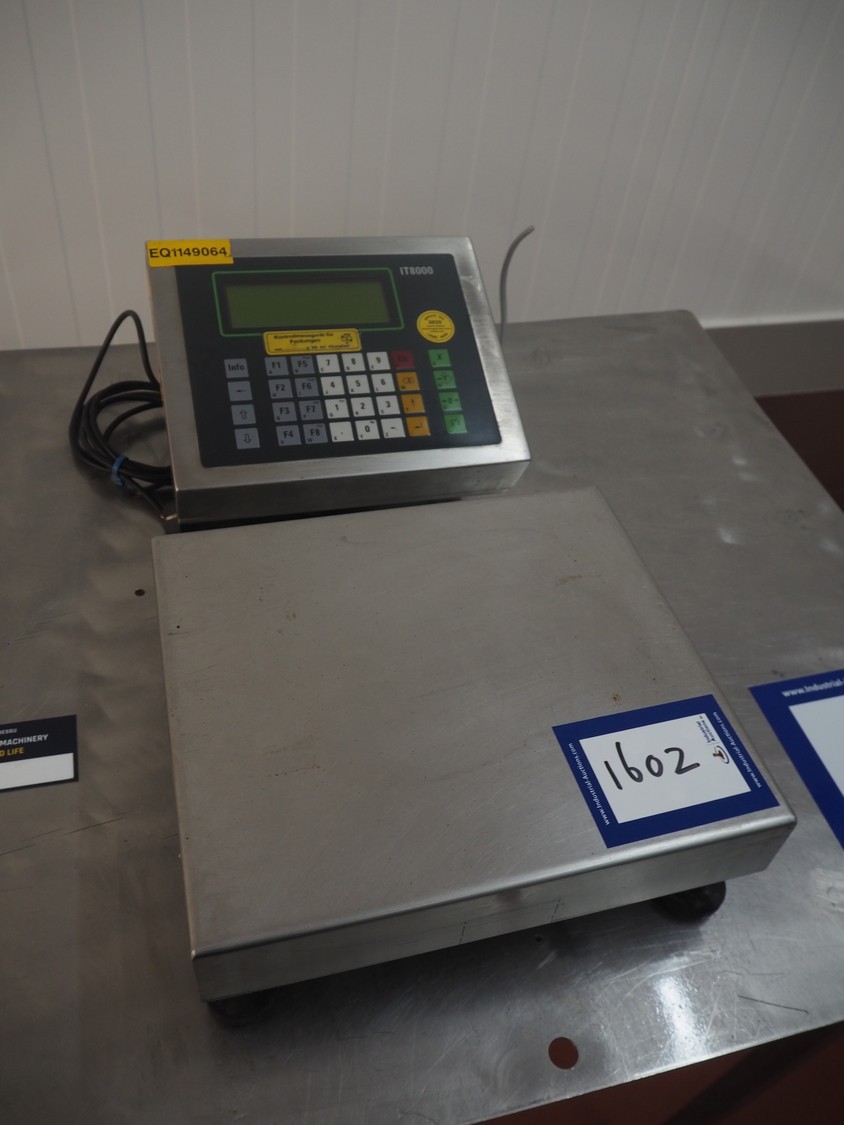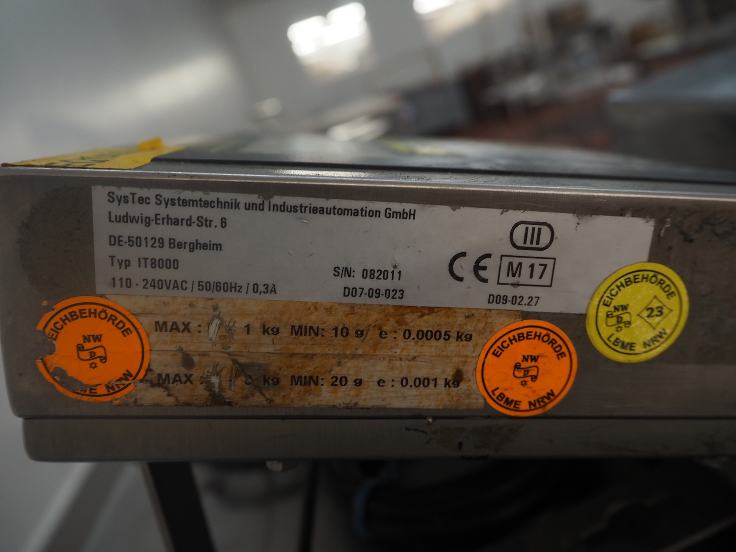 SysTec s/s weighing scale, type: IT8000, serial number: 082011, 110/240 V, 50/60 Hz, 0.3 A, scale dimensions: 300 mm x 270 mm.