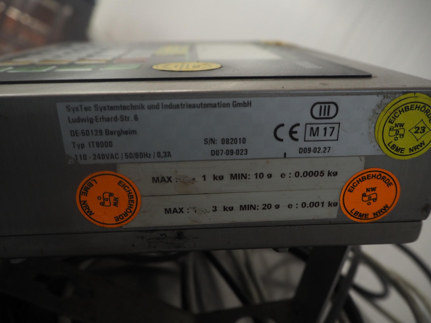 SysTec s/s weighing scale, type: IT8000, serial number: 082010, 110/240 V, 50/60 Hz, 0.3 A, scale dimensions: 300 mm x 270 mm.