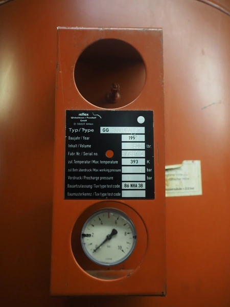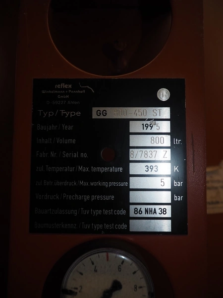 Reflex steel pressure vessel, type: GG 800-450 ST, serial number: 8/7837 Z, year of construction: 1995, volume: 800 liter, dimensions: Ø 750 mm x 2300 mm.