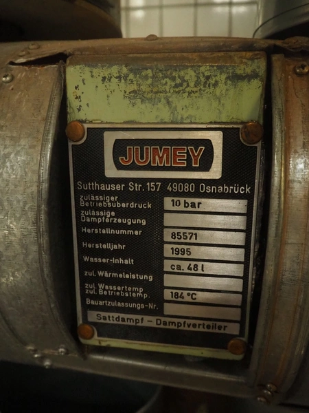 Jumey steam distributor for saturated steam, number: 85571, year of construction: 1995, capacity: 48 liter, maximum temperature: 184°C, dimensions: 2300 mm x 400 mm x 1200 mm.