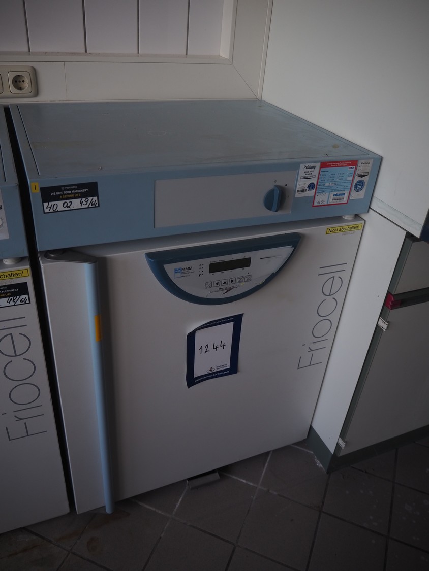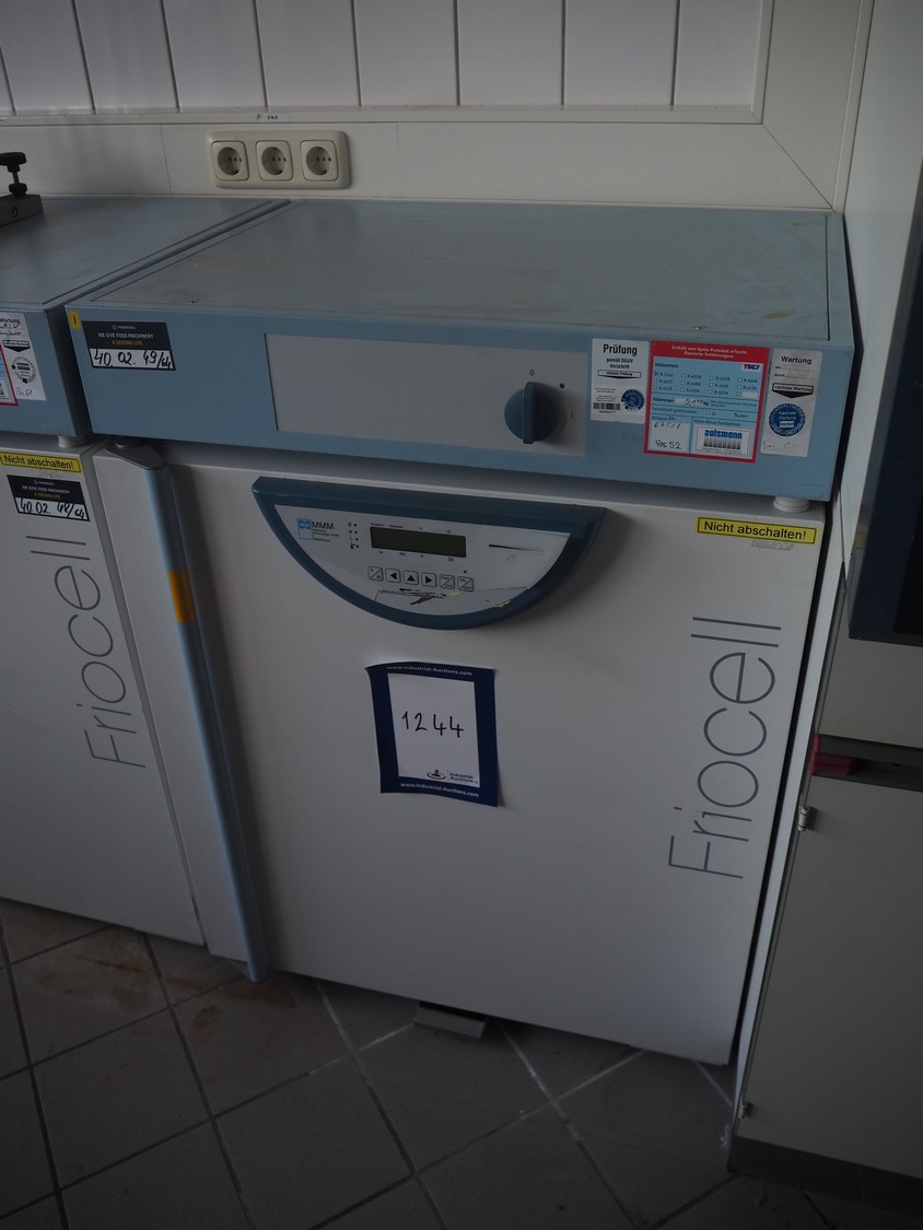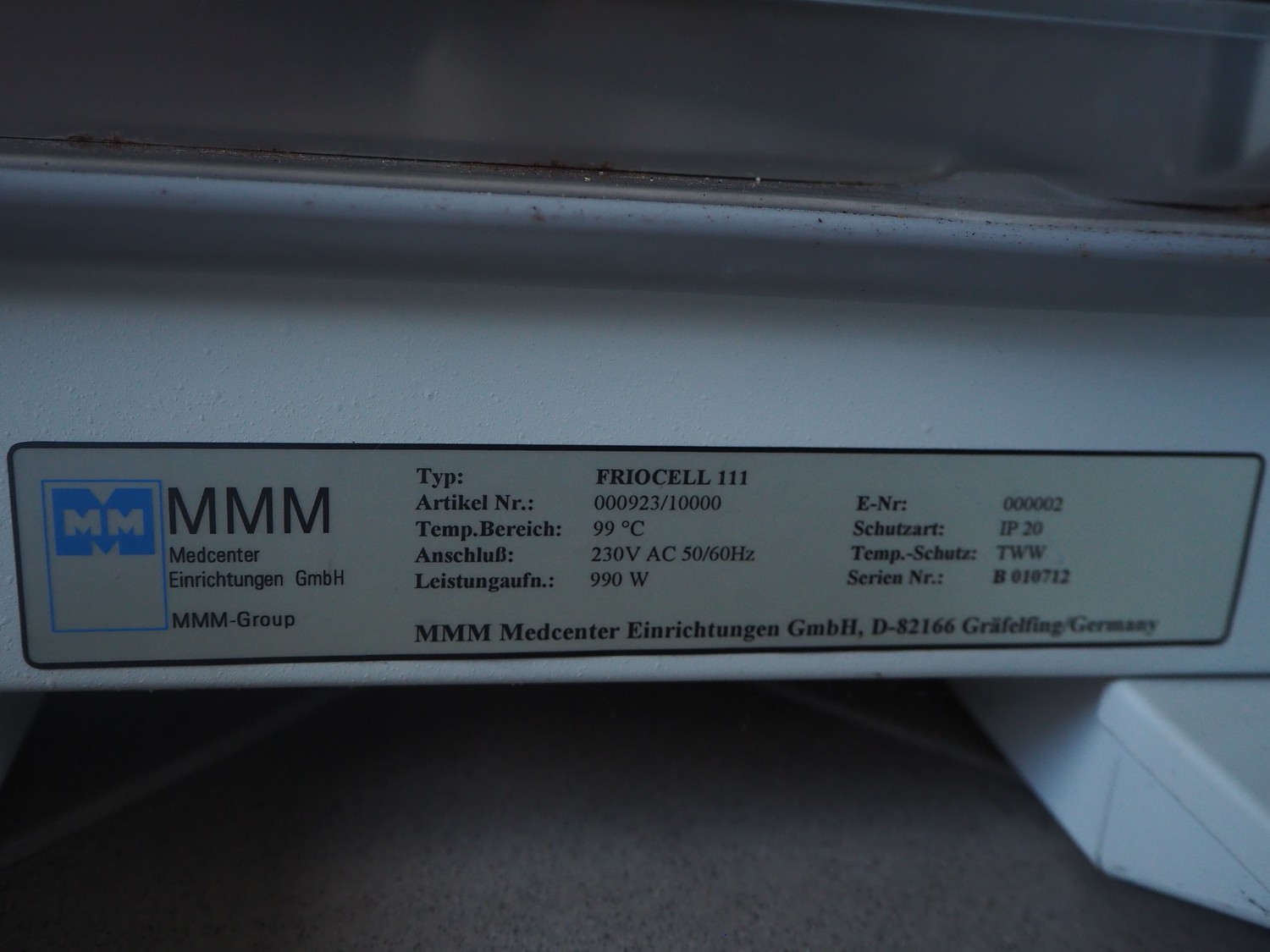 MMM-Group incubator, model: Friocell, type: FRIOCELL 111, serial number: B 010712, 230 V, 50/60 Hz, 990 W, capacity: 99 °C, dimensions: 760 mm x 640 mm x 1000 mm.