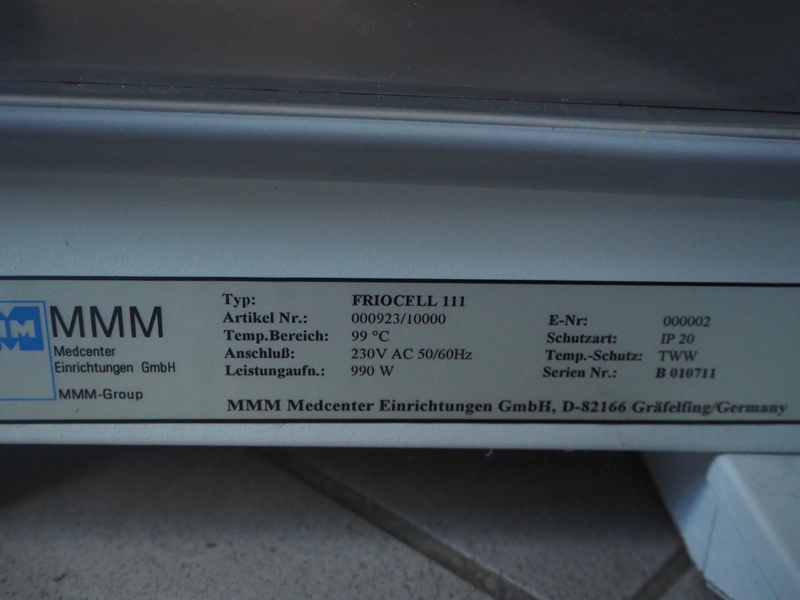 MMM-Group incubator, model: Friocell, type: FRIOCELL 111, serial number: B 010711, 230 V, 50/60 Hz, 990 W, capacity: 99 °C, dimensions: 760 mm x 640 mm x 1000 mm.