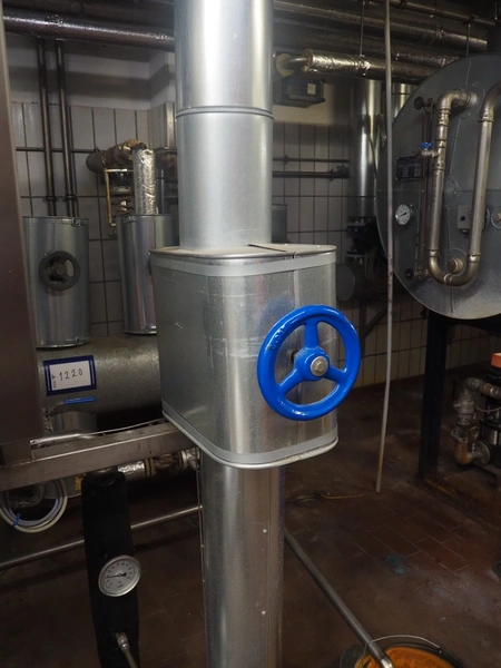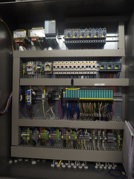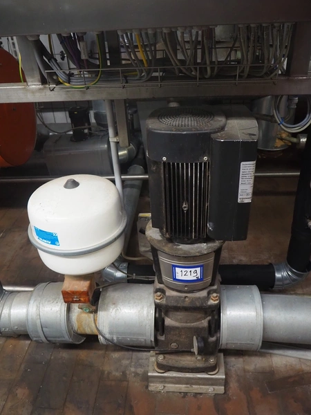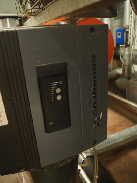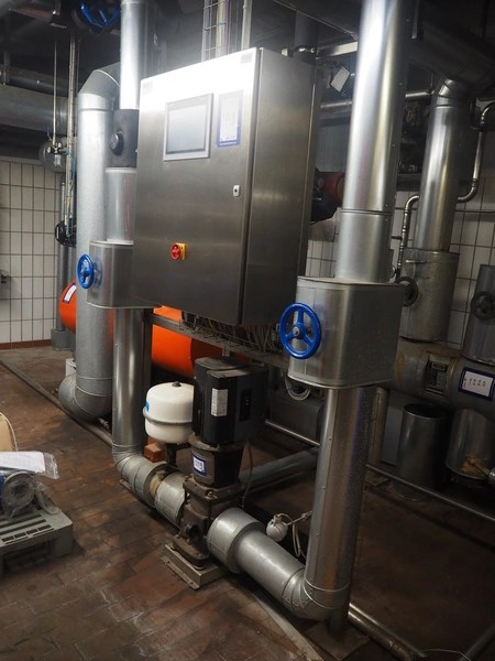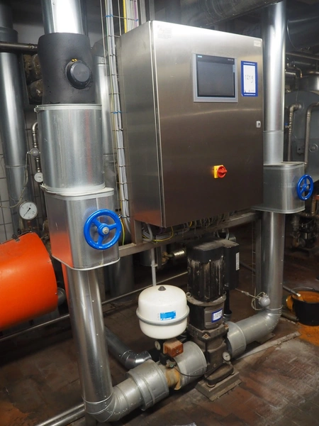 Control panel for warm water and steam distribution with Grundfos centrifugal pump, type: CRE45-1 A-F-A-E-HQQE, dimensions: 1800 mm x 800 mm x 2250 mm.