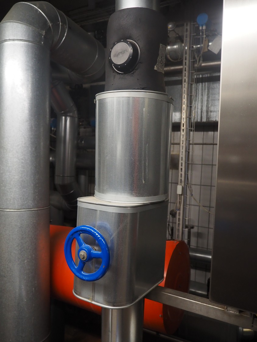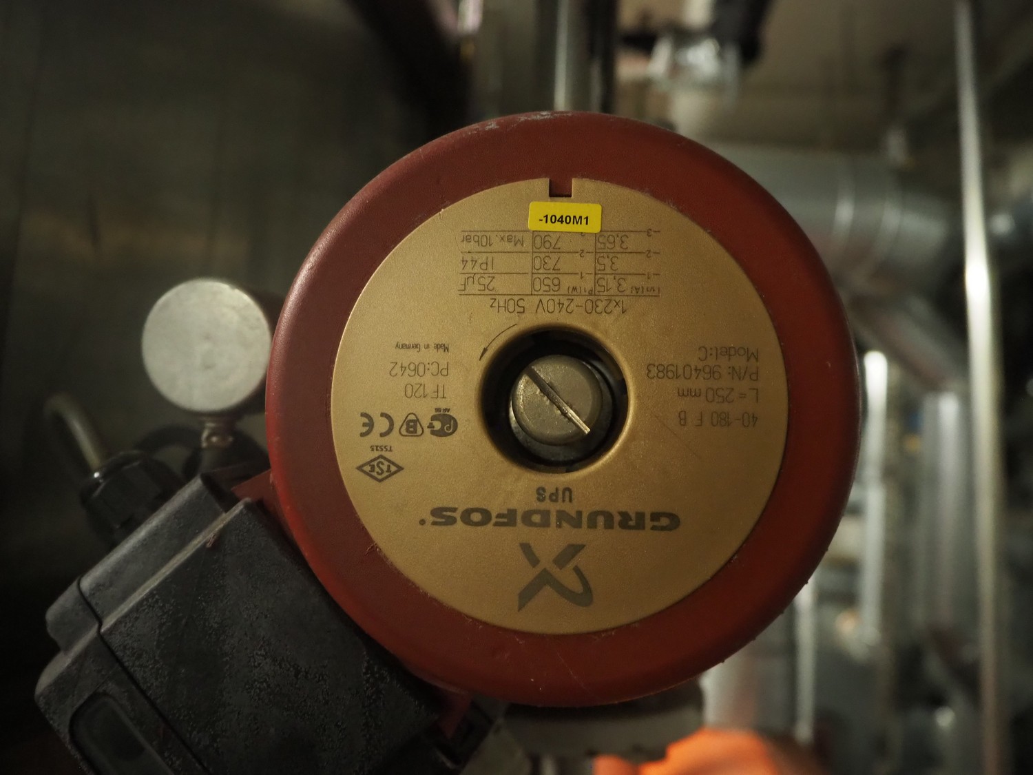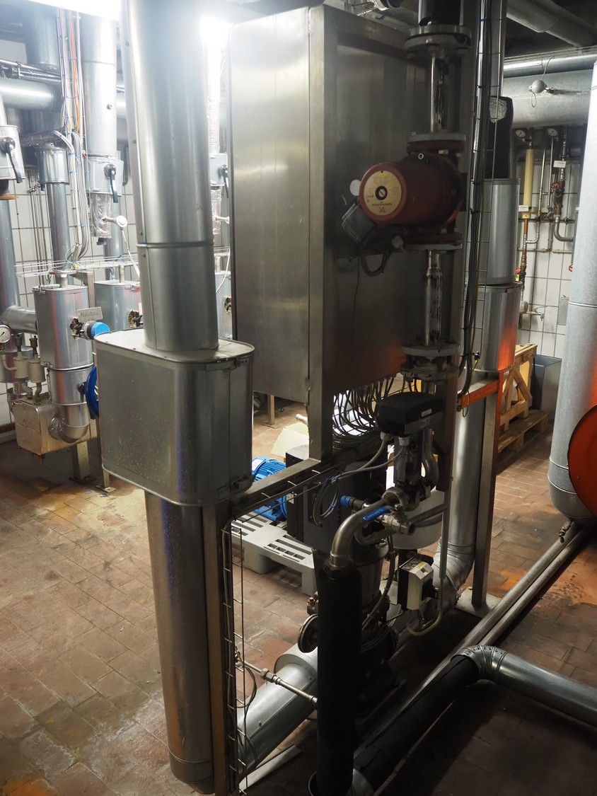 Control panel for warm water and steam distribution with Grundfos centrifugal pump, type: CRE45-1 A-F-A-E-HQQE, dimensions: 1800 mm x 800 mm x 2250 mm.