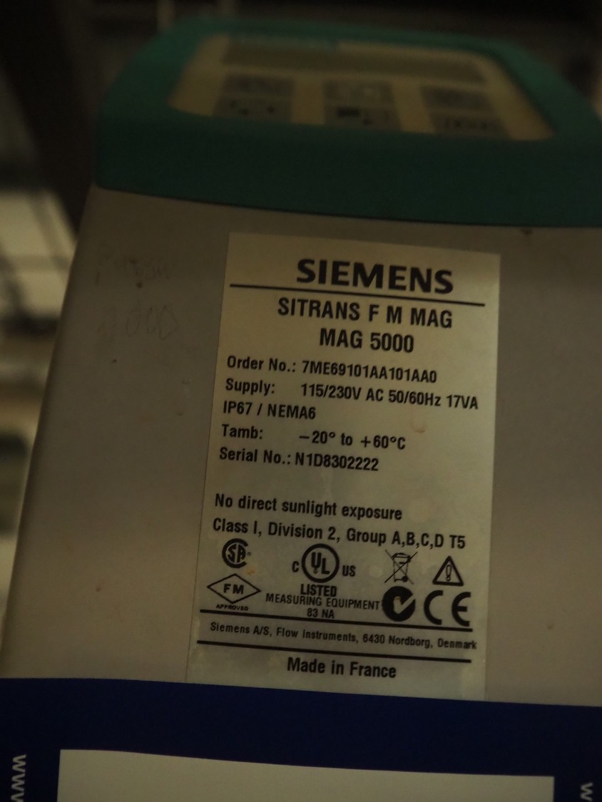 Siemens flowmeter, model: Sitrans F M MAG 5000, serial number: N1D8302222, 115/230 V, 50/60 Hz, dimensions: 200 mm x 150 mm x 450 mm.