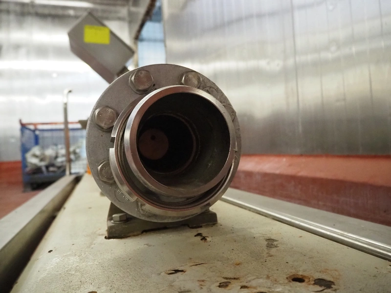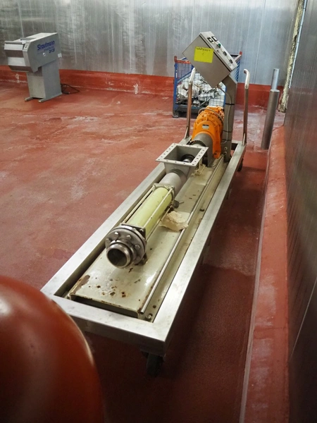 Netzsch progressive cavity pump on s/s trolley, type: 8NES 20A, machine number: 220344, year of construction: 1990, s/s screw, diameter screw: 100 mm, tier: 90 mm, total dimensions: 2900 mm x 650 mm x 1300 mm.