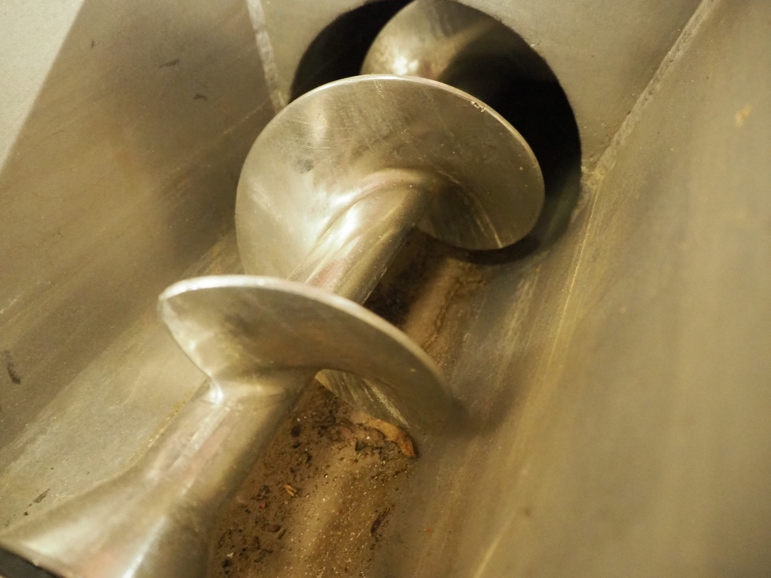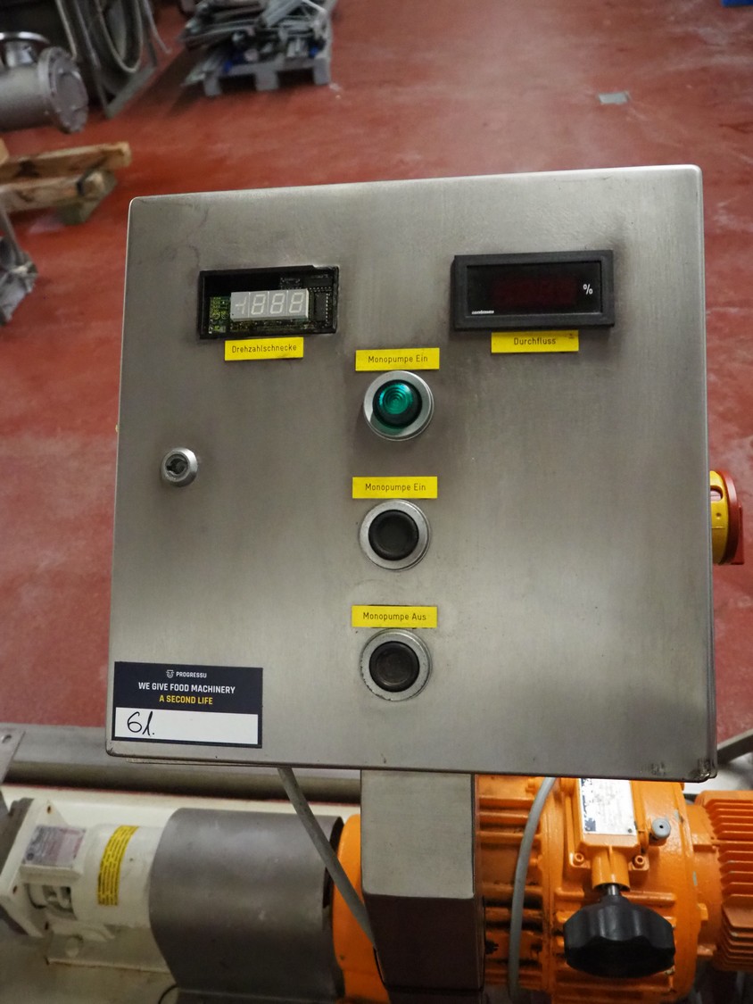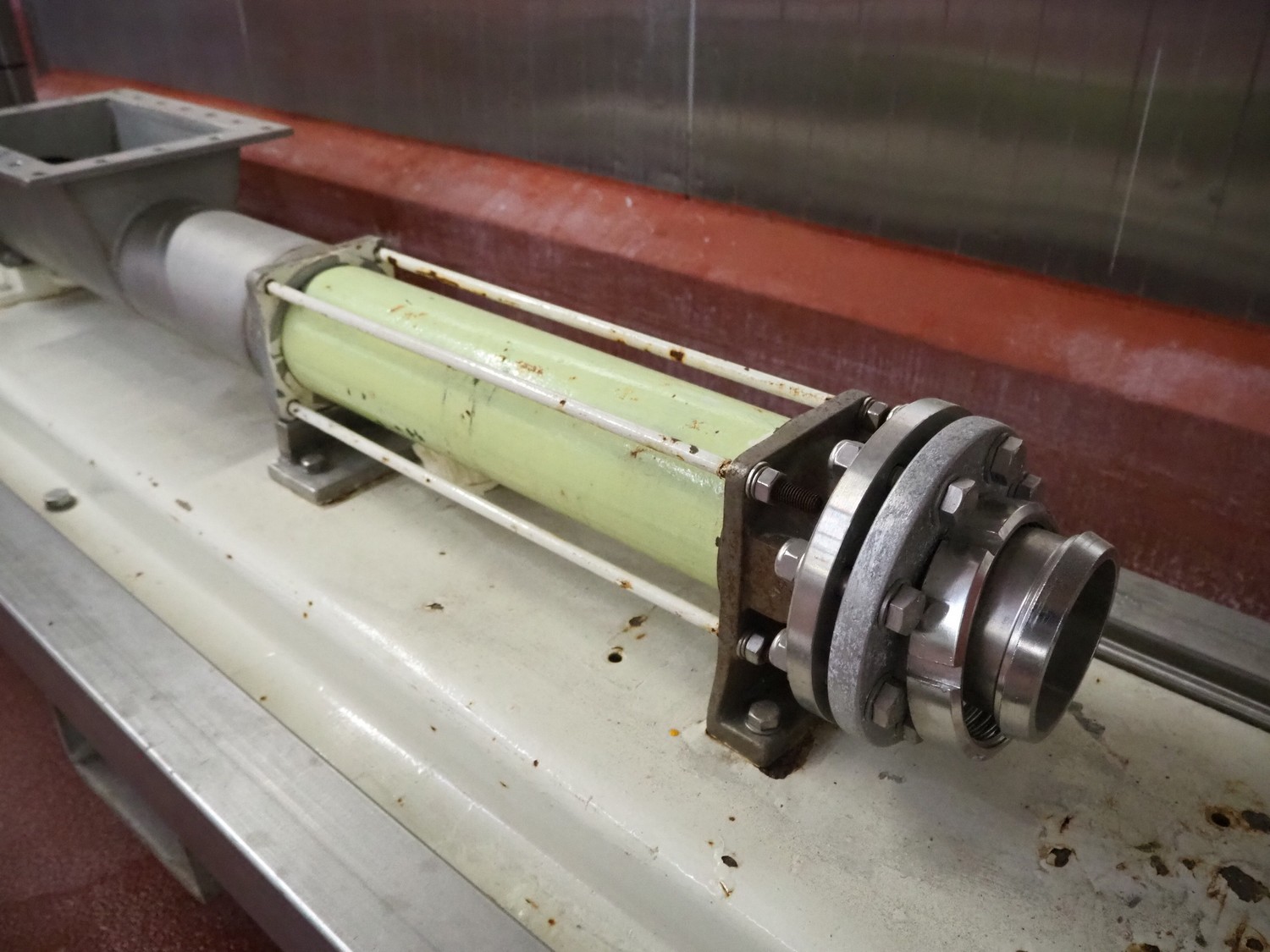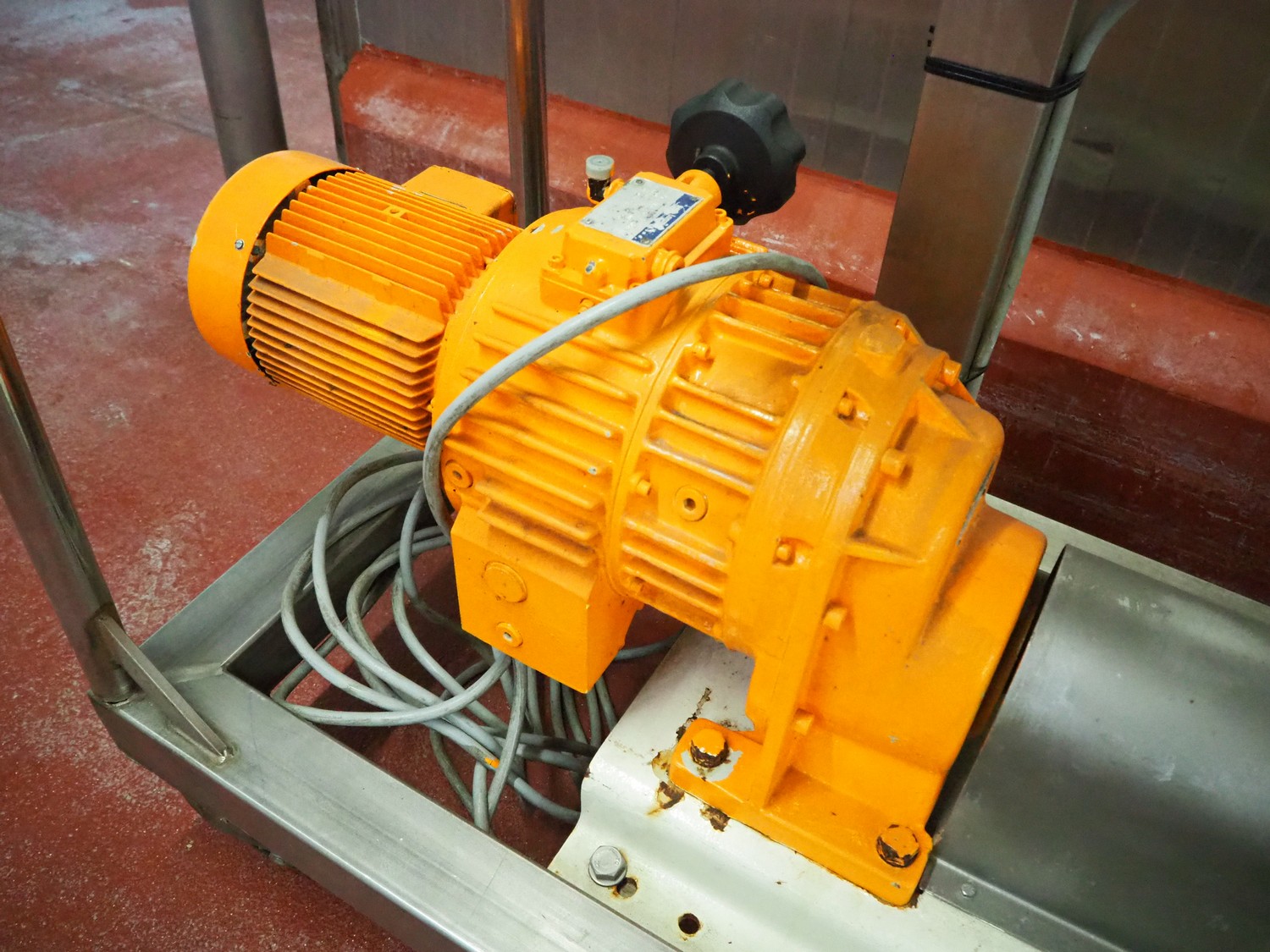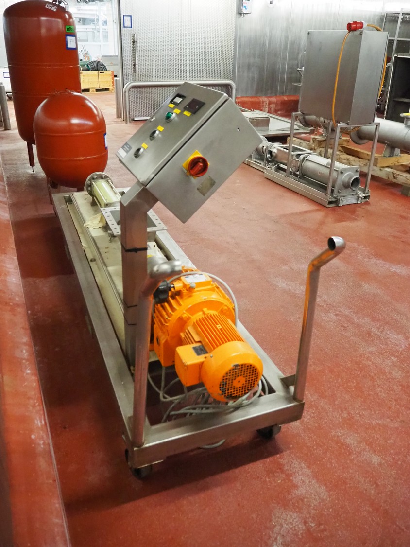 Netzsch progressive cavity pump on s/s trolley, type: 8NES 20A, machine number: 220344, year of construction: 1990, s/s screw, diameter screw: 100 mm, tier: 90 mm, total dimensions: 2900 mm x 650 mm x 1300 mm.
