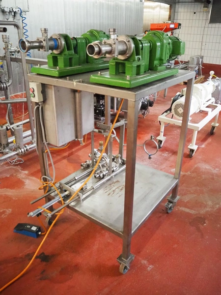 S/s trolley with 2 Netzsch progressing cavity pumps, type: (2x) IBD 15, year of construction: 1977, total dimensions: 1200 mm x 800 mm x 1500 mm.