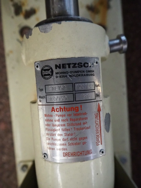 2 Netzsch progressing cavity pumps, type: 2NL15A, year of construction: 1976, and type: 2NL15A, machine number: 105939, year of construction: 1979, dimensions: (2x) 1170 mm x 350 mm x 1060 mm. Incomplete.