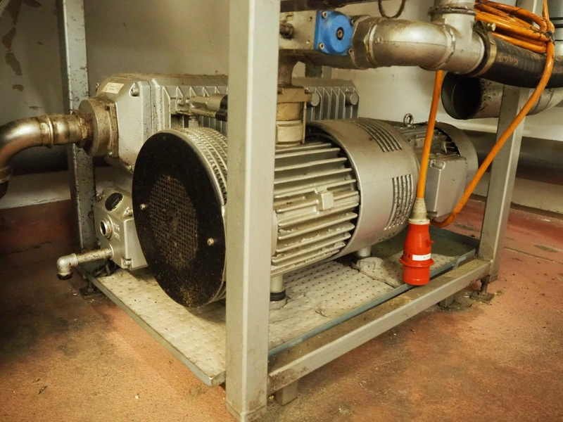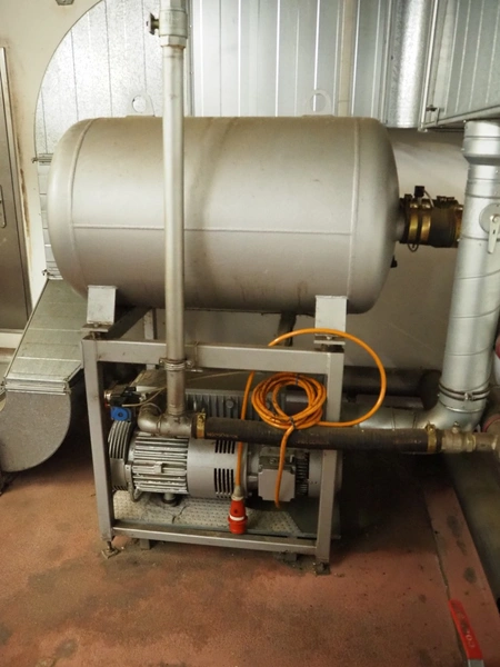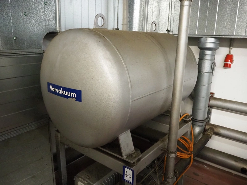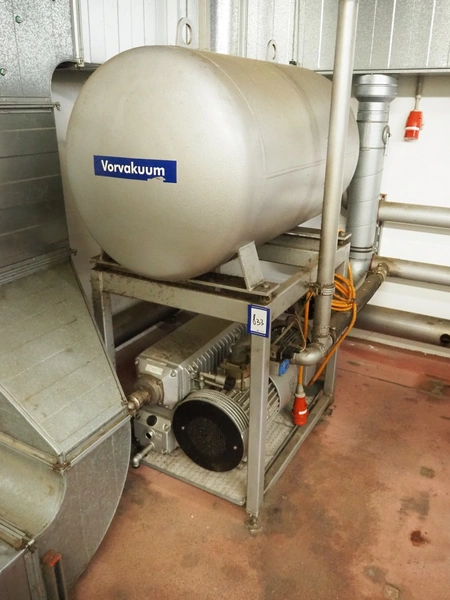 S/s frame with Busch vacuum pump and pressure vessel, type: RA 0250 D 561 QMZZ, number: C9908000532, dimensions: 1300 mm x 850 mm x 1750 mm.