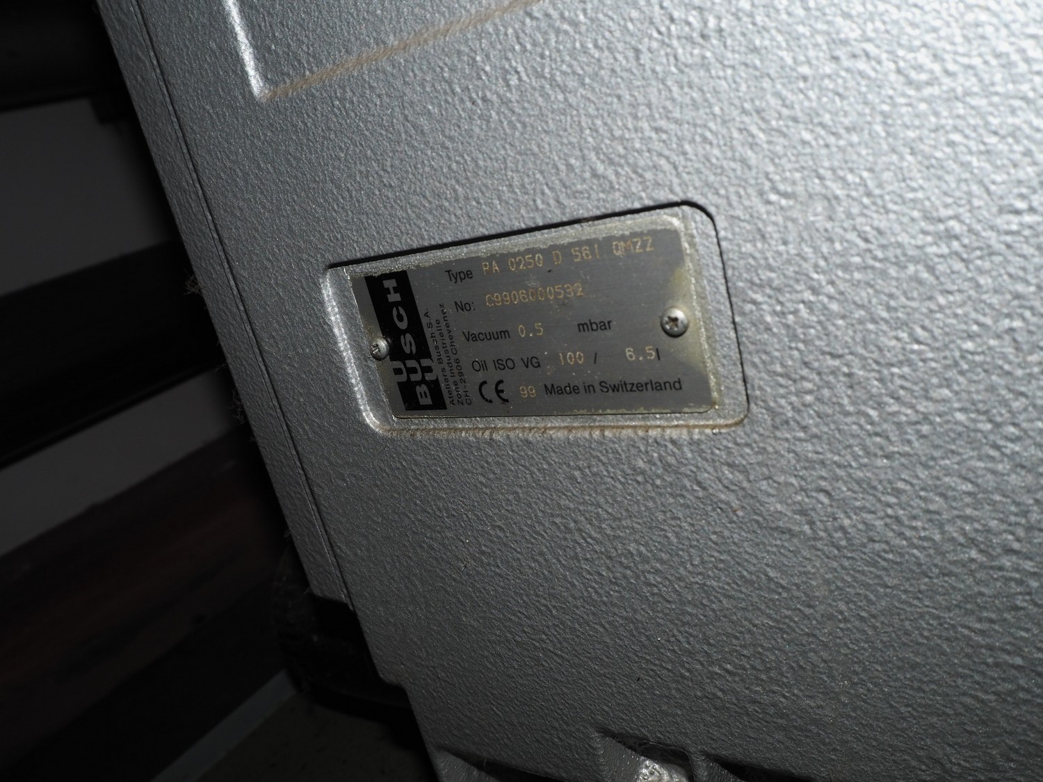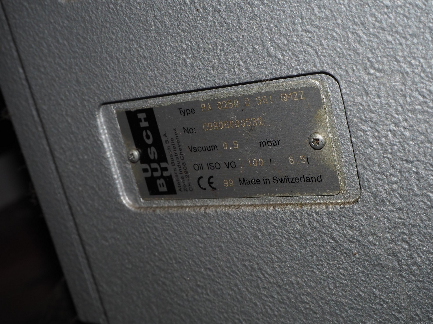 S/s frame with Busch vacuum pump and pressure vessel, type: RA 0250 D 561 QMZZ, number: C9908000532, dimensions: 1300 mm x 850 mm x 1750 mm.