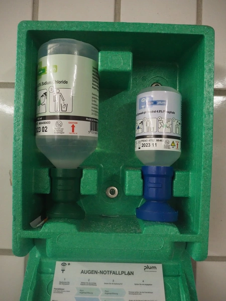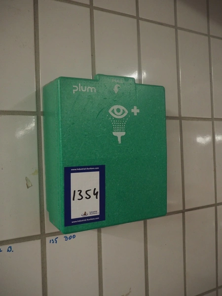Wall mounted cabinet with Plum eye wash kit, dimensions: 220 mm x 100 mm x 280 mm.
