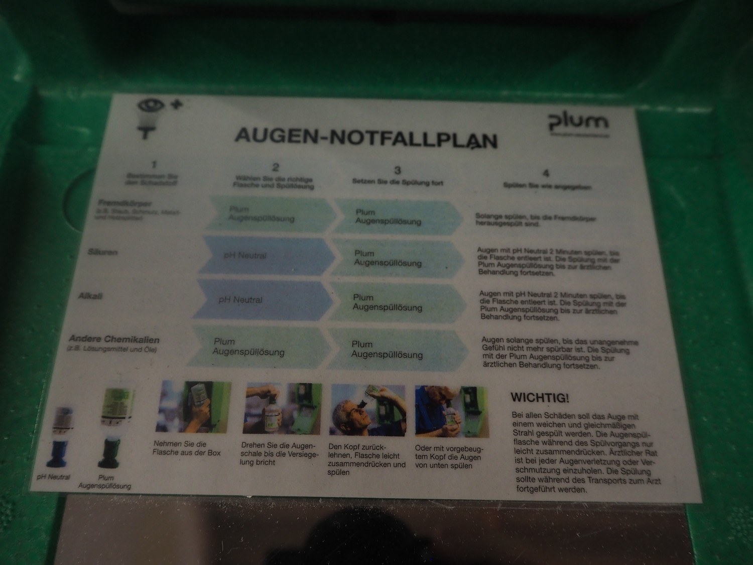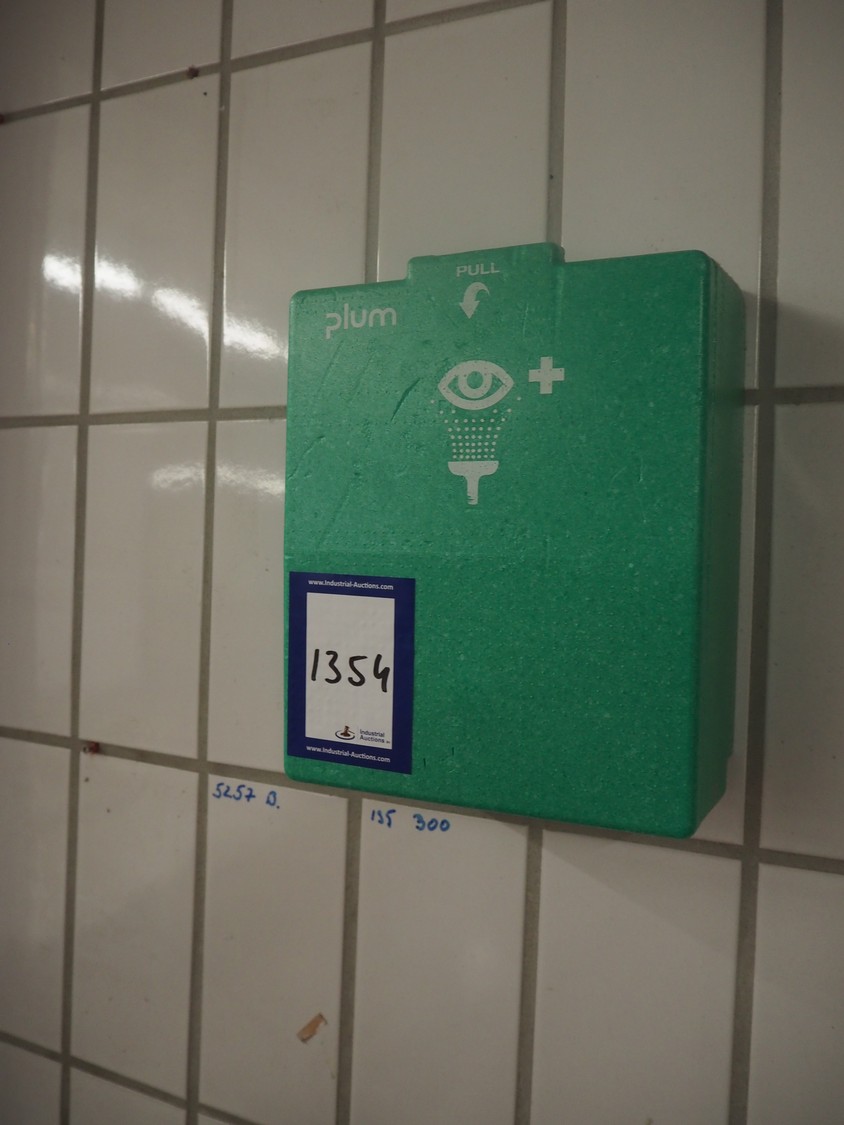 Wall mounted cabinet with Plum eye wash kit, dimensions: 220 mm x 100 mm x 280 mm.