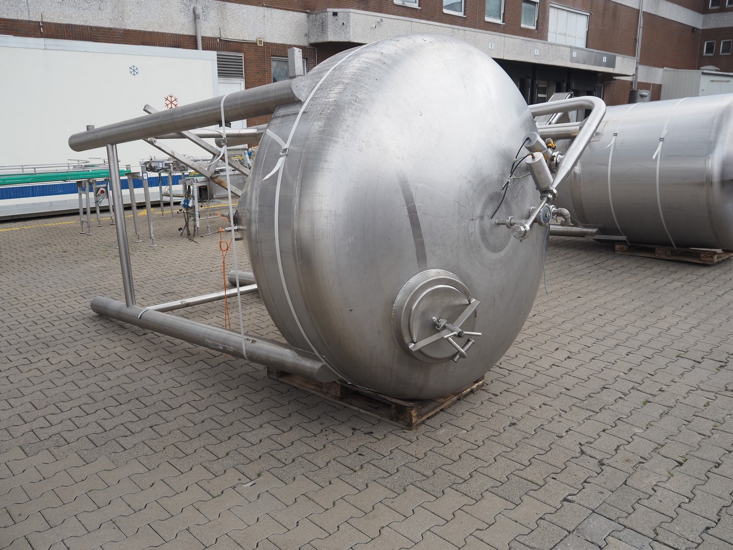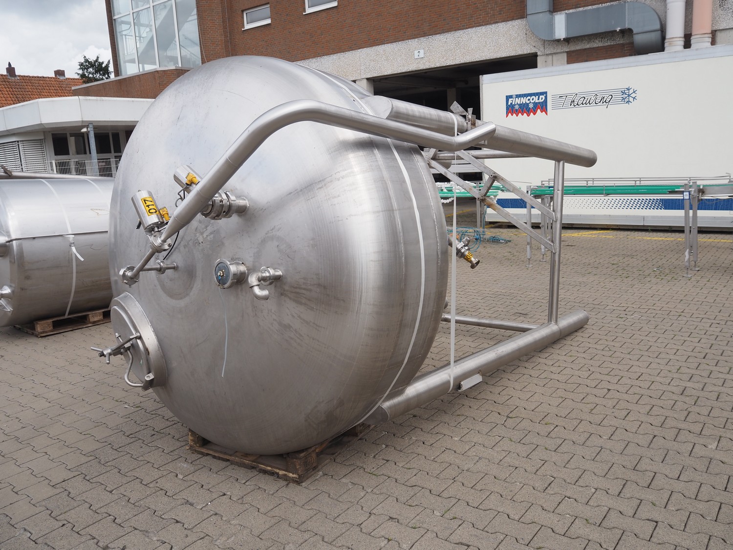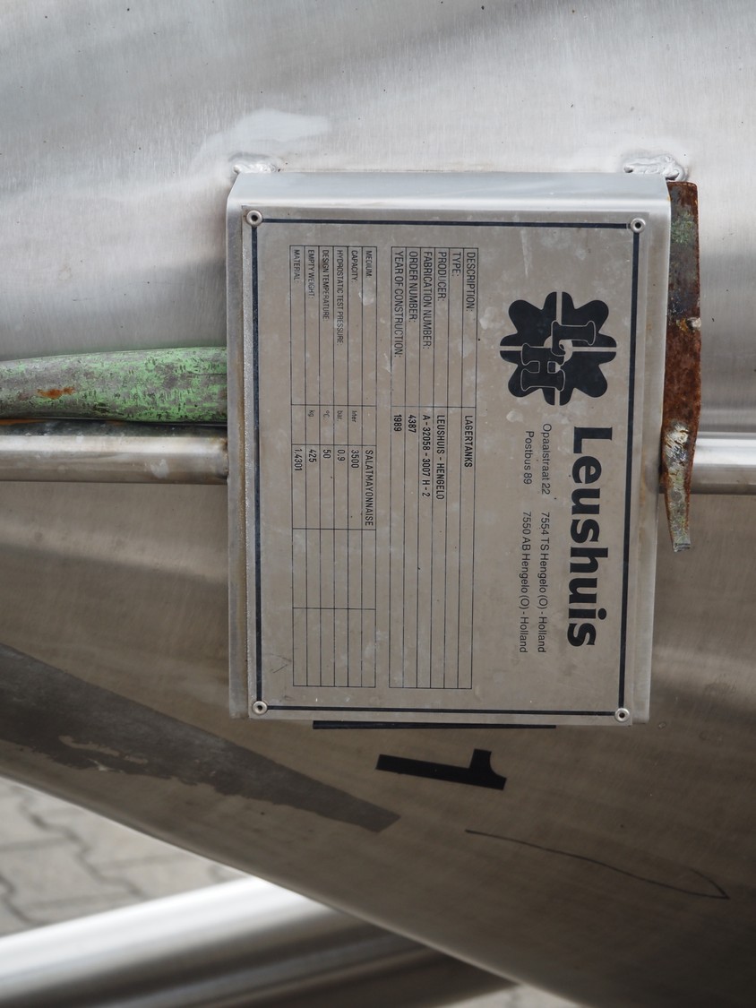Leushuis s/s storage tank for mayonnaise, fabrication number: A-32058-3007 H-2, year of construction: 1989, medium: Salatmayonnaise, capacity: 3500 liter, hydrostatic test pressure: 0.9 bar, design temperature: 50 °C, empty weight: 425 kg, dimensions: Ø 2000 mm x 3600 mm.