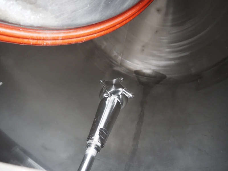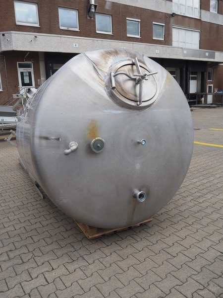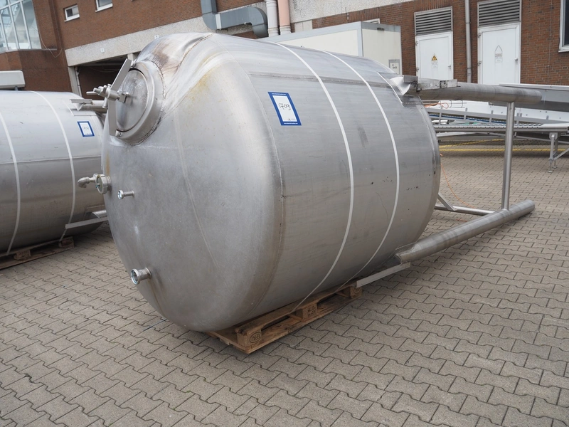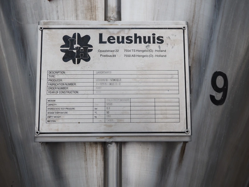 Leushuis s/s storage tank for mayonnaise, fabrication number: A-32058-3005 H-2, year of construction: 1989, medium: Salatmayonnaise, capacity: 5000 liter, hydrostatic test pressure: 0.9 bar, design temperature: 50 °C, empty weight: 580 kg, dimensions: Ø 1800 mm x 4900 mm. Tank is damaged.