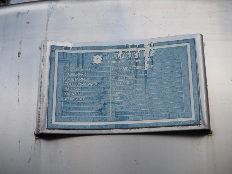 Leushuis Projects & Engineering B.V. s/s tank with Typhoon mixer, tag number: T 3.3, P&ID; number: A. 32553.2003.C, year of construction: 1993, volume: 1500 liter, Typhoon mixer, number: 16TY0169, dimensions: Ø 1200 mm x 3400 mm.