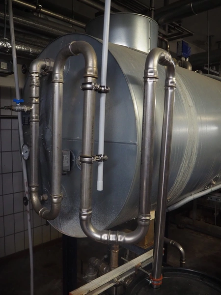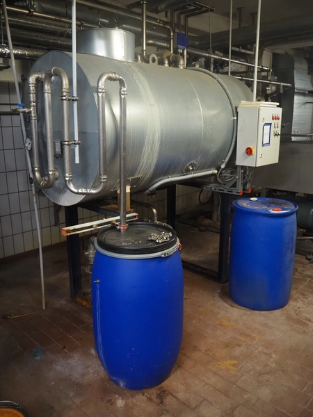 Georg Hagelschuer GmbH insulated condensate collection tank, number: 12-50078-B01, year of construction: 2013, volume: 1000 liter, dimensions: 2200 mm x 1500 mm x 2600 mm. With 2 Grundfos circulation pumps.