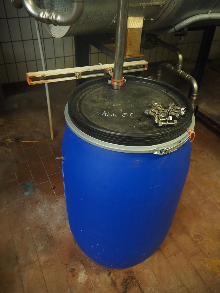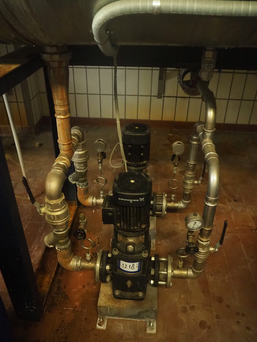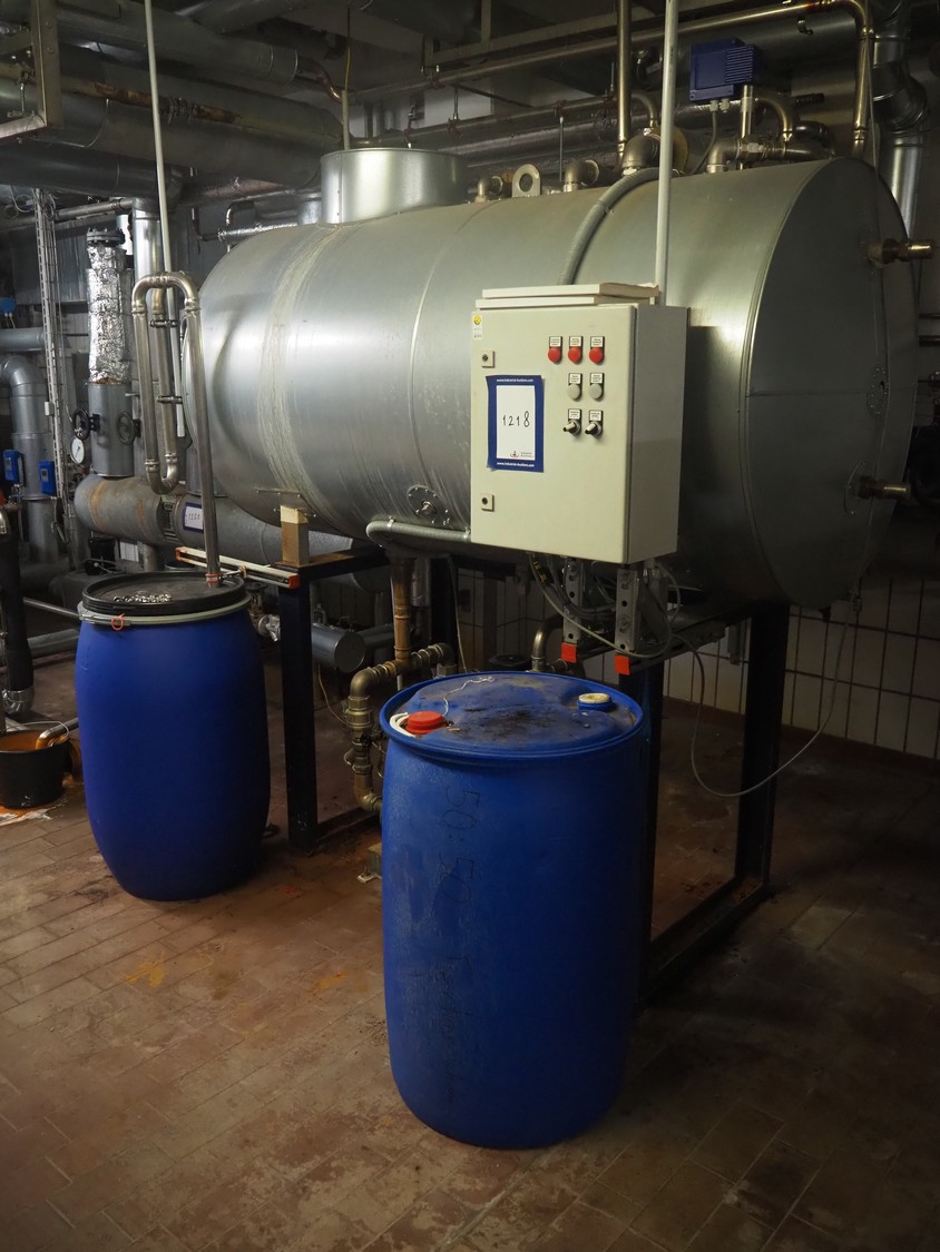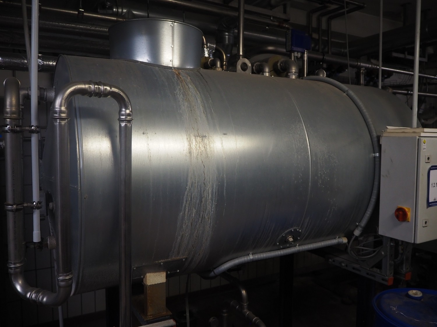 Georg Hagelschuer GmbH insulated condensate collection tank, number: 12-50078-B01, year of construction: 2013, volume: 1000 liter, dimensions: 2200 mm x 1500 mm x 2600 mm. With 2 Grundfos circulation pumps.
