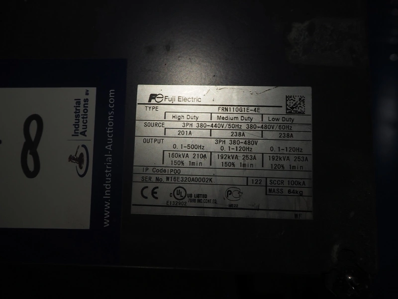 Fuji Electric battery charger, type: FRN110G1E-4E, serial number: W16E320A0002K, 380/440/480 V, 3 Ph, 50/60 Hz, 201/238 A, weight: 64 kg, dimensions: 750 mm x 550 mm x 350 mm.