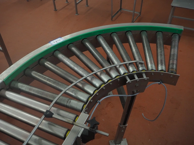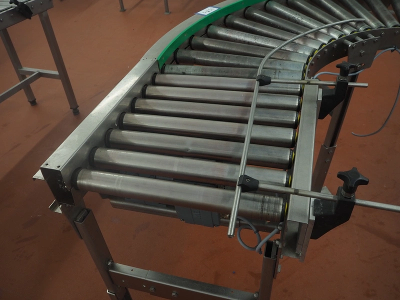 90° curve conveyor, s/s frame, electrically driven s/s rollers, roller width: 450 mm, total dimensions: 1500 mm x 1000 mm x 880 mm.