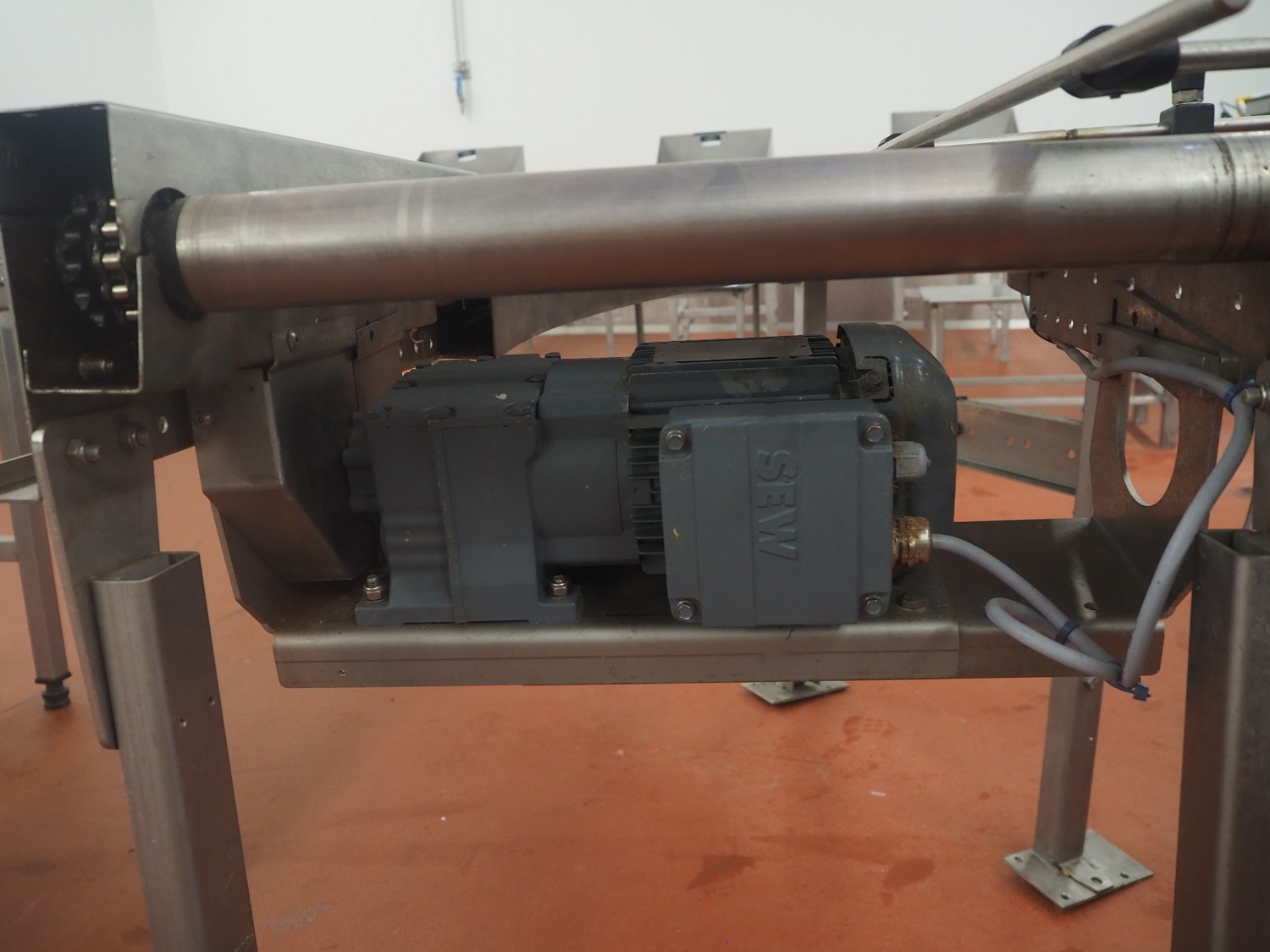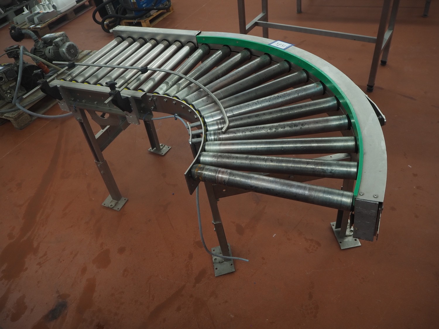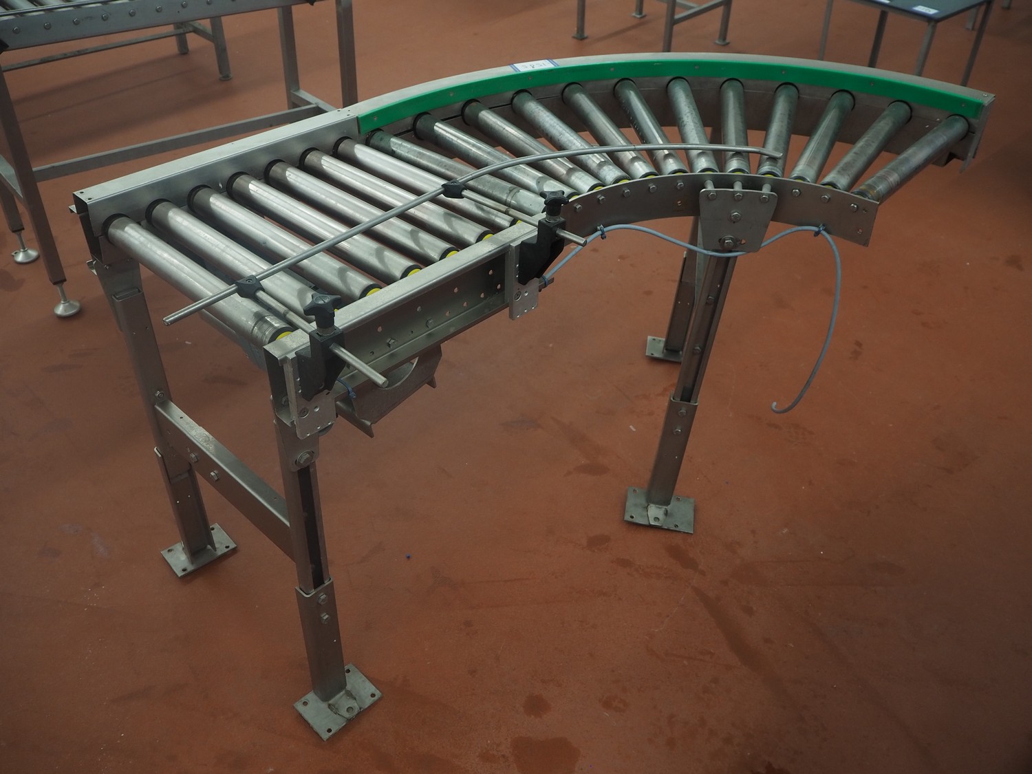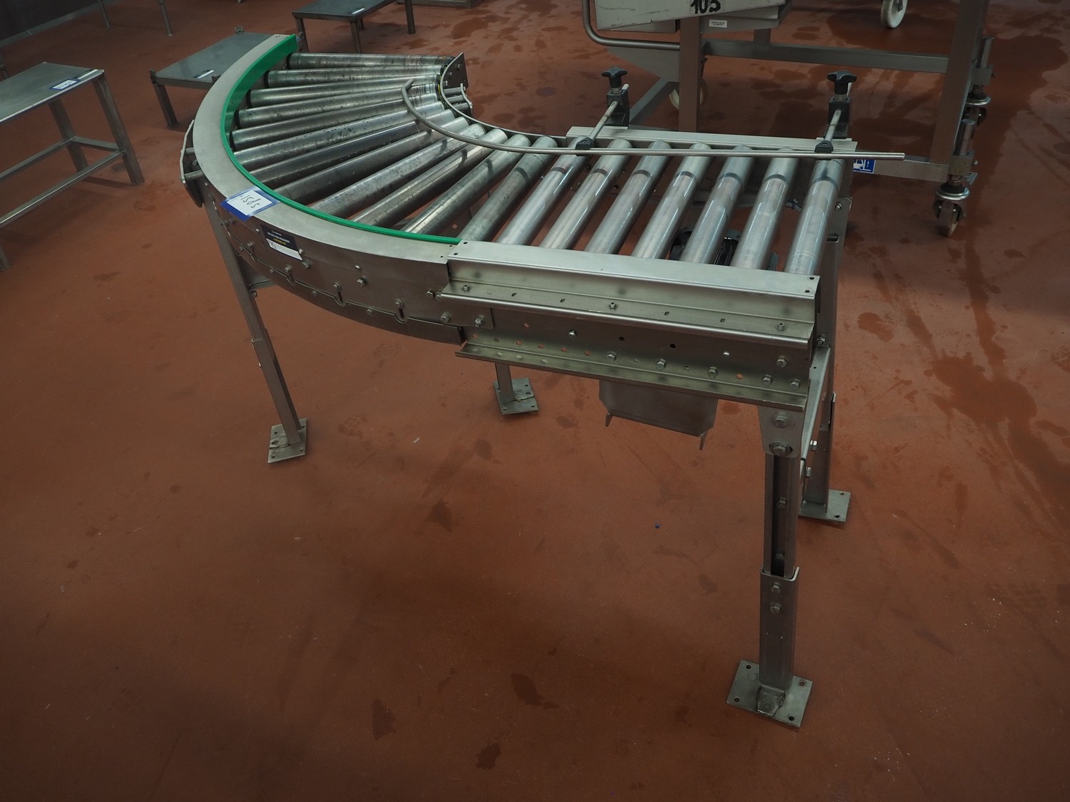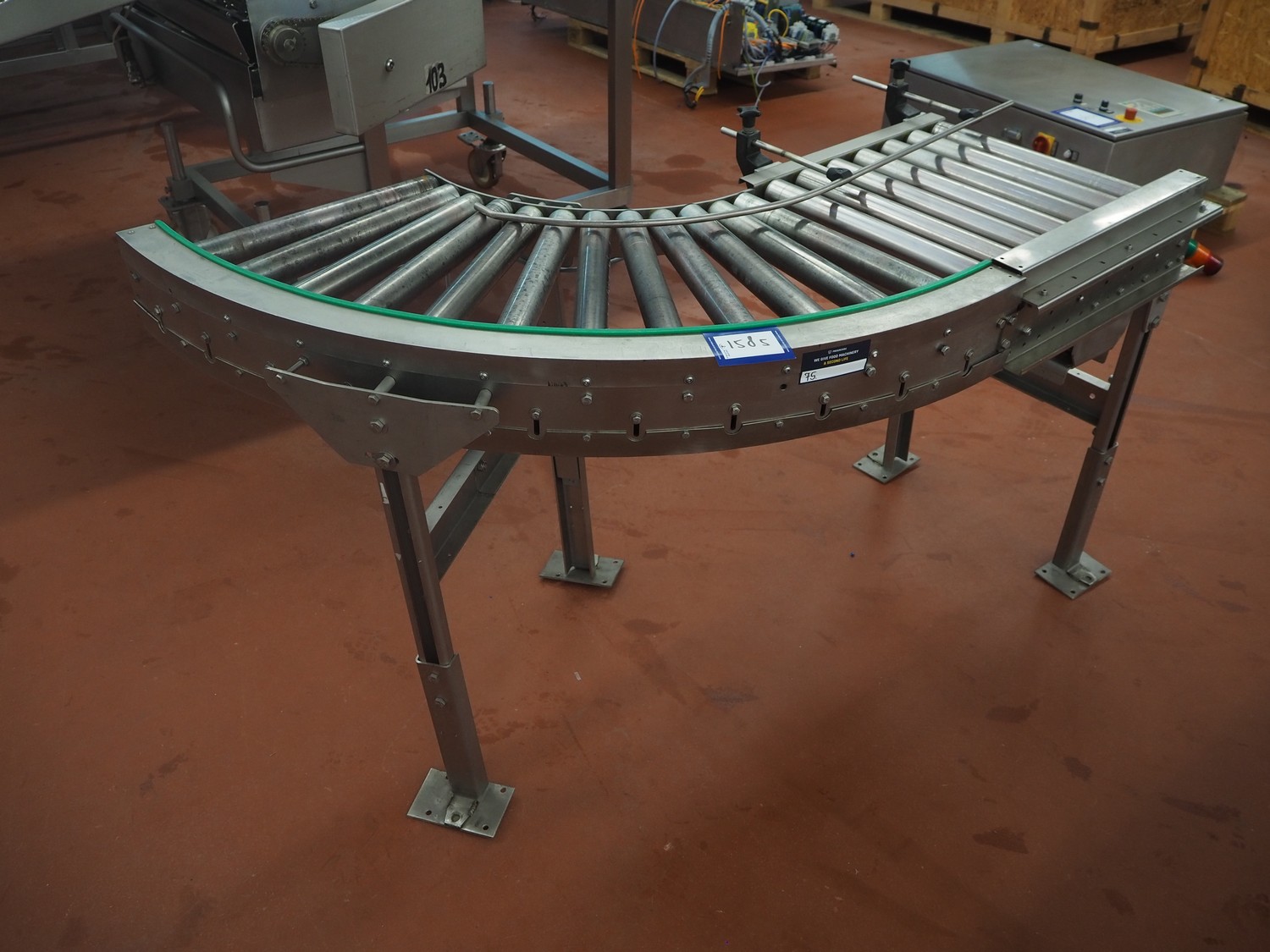 90° curve conveyor, s/s frame, electrically driven s/s rollers, roller width: 450 mm, total dimensions: 1500 mm x 1000 mm x 880 mm.
