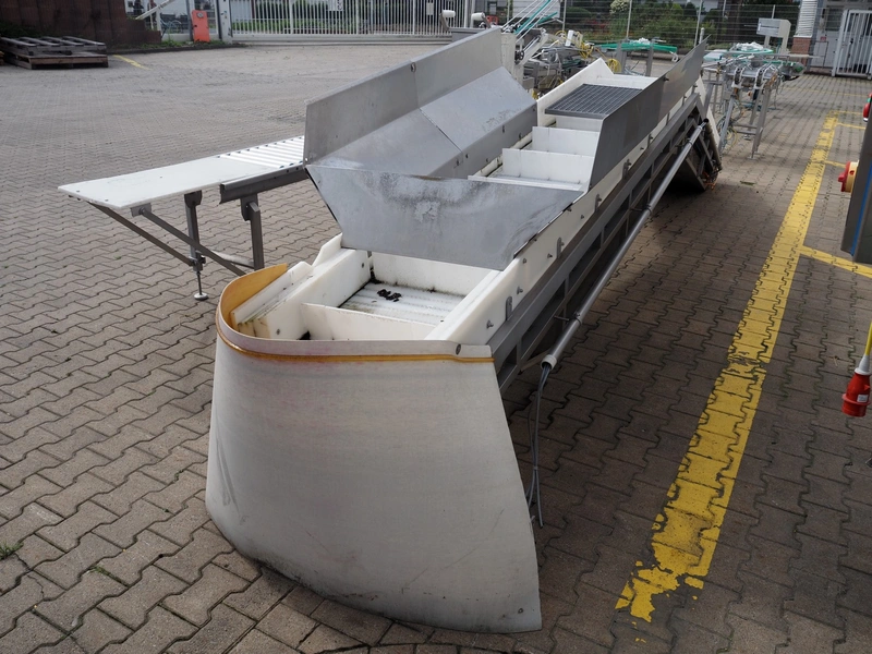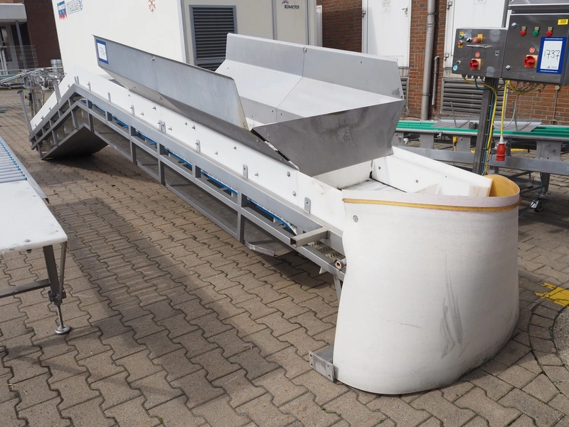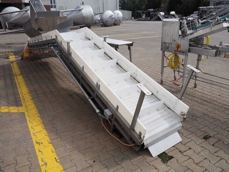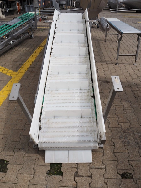 Elevating belt, s/s frame, plastic belt with dividers, belt width: 600 mm, dividers height: 130 mm, distance between dividers: 400 mm, total dimensions: 7700 mm x 1150 mm x 1400 mm.